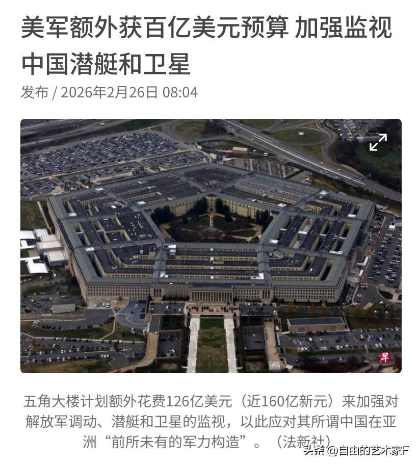 五角大楼:将砸钱126亿,监控中方潜艇和卫星 彭博社今天(北京时间2月26日)报道:五角大楼计划花126亿美元来加强对解放军调动、潜艇和卫星的监视。用来提升美军在整个印太地区的装备,以此应对中国在亚洲的军力构造。 还有助于扩大波音宇宙飞船的行动规模。目前这笔军费预算支出,已经给了提交给美国国会进行审批。 对于该事件我们是怎么看的,特朗普频繁炒作中国威胁,印太危机,先是美菲军演,又是美日铁拳军演,昨天又启动了美韩军演,以及美泰金色眼镜蛇军演,将中国周边的国家全部都拉了去。 为的就是把中国定位为“首要战略竞争对手”,全方位围堵,阻止中国影响力上升。除此之外,就是服务本国内部的军工复合体。拼命地掏美国人的钱来满足这些背后大佬。 殊不知他才是印太的搅屎棍。但中国在亚洲的影响力首屈一指,已经成为亚洲稳定的核心。所以纵使特朗普和五角大楼怎样作妖,在亚洲他都翻不出多大的花