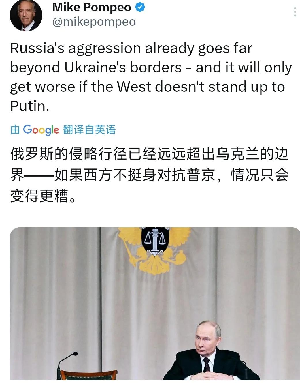 瘦削的美国前国务卿蓬佩奥日前又在社交媒体发声,称俄罗斯的“侵略行徑”已不再局限于