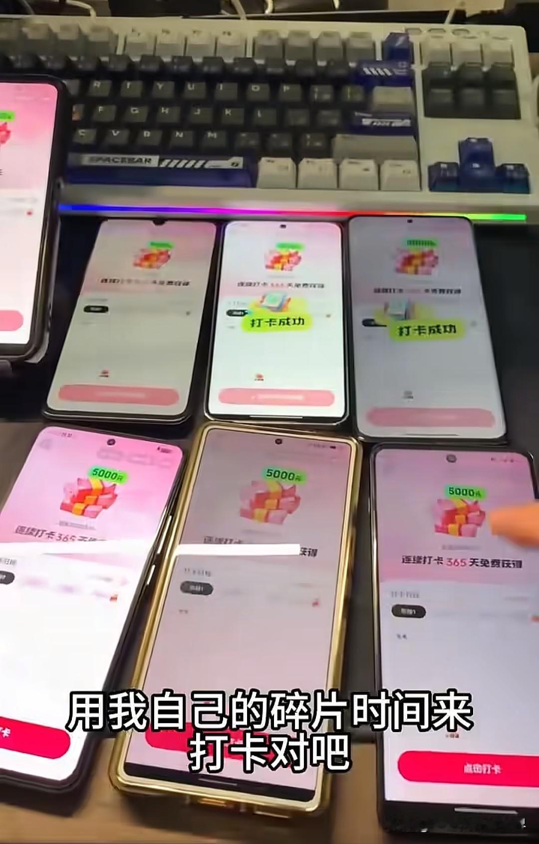 【用12部手机打卡365天?这“薅羊毛”代价太大了!】 你见过用8部、甚至12部手机同时打卡的“狠人”吗?最近网上疯传的“365天打卡领现金”挑战,让不少人开启了“人肉打卡机”模式——有人专门买了多部旧手机,每天轮流点击“打卡”按钮,就为了那几百上千元的奖励。可算过时间账吗?就算12部手机同时操作,每天至少也要花十几分钟,一年下来就是60多个小时,相当于无薪加班整整一周! 其实这种“打卡陷阱”早有套路:前期让你轻松拿到小奖励,后期设置复杂任务或突然提高门槛。更坑的是,有些平台会“意外断签”或直接隐藏入口。就像网友吐槽的:“12部手机打卡半年,结果平台说活动结束,钱都没到账!” 想薅羊毛却被反薅,这才是最扎心的。与其耗时间当“打卡民工”,不如把精力用在提升自己或做副业上。真正的“薅羊毛”,是让时间产生复利,而不是被APP当流量工具。 你遇到过“打卡陷阱”吗?下次再看到“免费领钱”,先问自己:“这时间,我耗得起吗?”