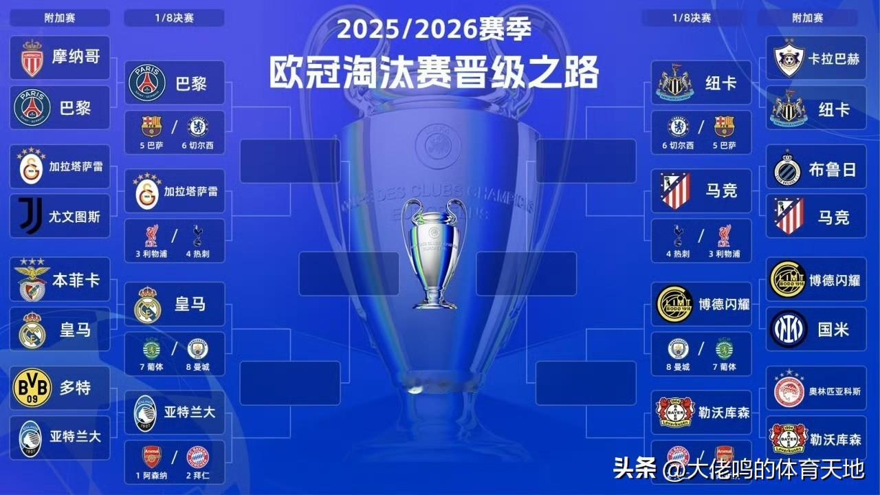 欧冠16强出炉英超继续遥遥领先,最多队伍如愿晋级,下赛季5个名额无悬念继续……2月27日周五19:00进行抽签,这也将是本赛季欧冠的最后一次抽签。一些潜在的对阵已浮现,皇马-曼城、巴萨-巴黎、利物浦-马竞,这样一来肯定看点多多,估计不会都这样,但起码中一到两组,拭目以待[思考]鸣聊体育 ——阿森纳/拜仁vs勒沃库森/亚特兰大 利物浦/热刺vs马竞/加拉塔萨雷 巴萨/切尔西vs巴黎圣日耳曼/纽卡 葡萄牙体育/曼城vs皇马/博德闪耀