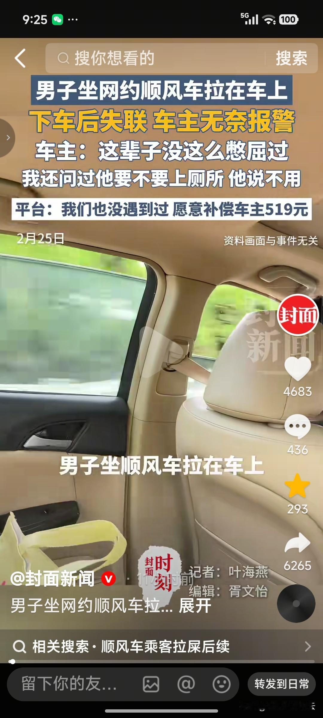 男子从山东老家回上海时,在顺风车平台接了一单,顾客是个40岁左右的男性。 男子上车后,坐在后排的座位上,车主称路过高速服务区时,他问过男子需不需要上厕所,男子说不用。 接下来在车辆行驶中,车主隐隐约约闻到车后排传来臭味。车主以为是男子吐了,后来男子又一直在往外扔东西,车主以为男子感冒了,扔的是擦鼻涕的卫生纸,也就没在意。 后来男子中途就下车了,车主到家后发现,他后排座椅上被男子抹的到处都是排泄物,原来男顾客在车上拉到裤子里了。 车主觉得特别恶心,打电话给男顾客,顾客不接电话。他报警,顾客还是拒绝见面,拒绝调解。车主只好把这件事反映到平台,平台开始时给他50元优惠券,车主不同意。后面经过协商,平台给了车主519元的洗车费。 虽然事情得到了解决。但是我觉得对这个顾客有点太仁慈了,本来车是被他弄脏的,就是他的责任。可是他不接电话,不接受调解,就拿他没治了吗?如果这件事就这样算了,会有越来越多的人效仿男子的行为。 我觉得平台方应该向男顾客追责,让他赔偿顾客的损失。 对于这件事,你怎么看呢?