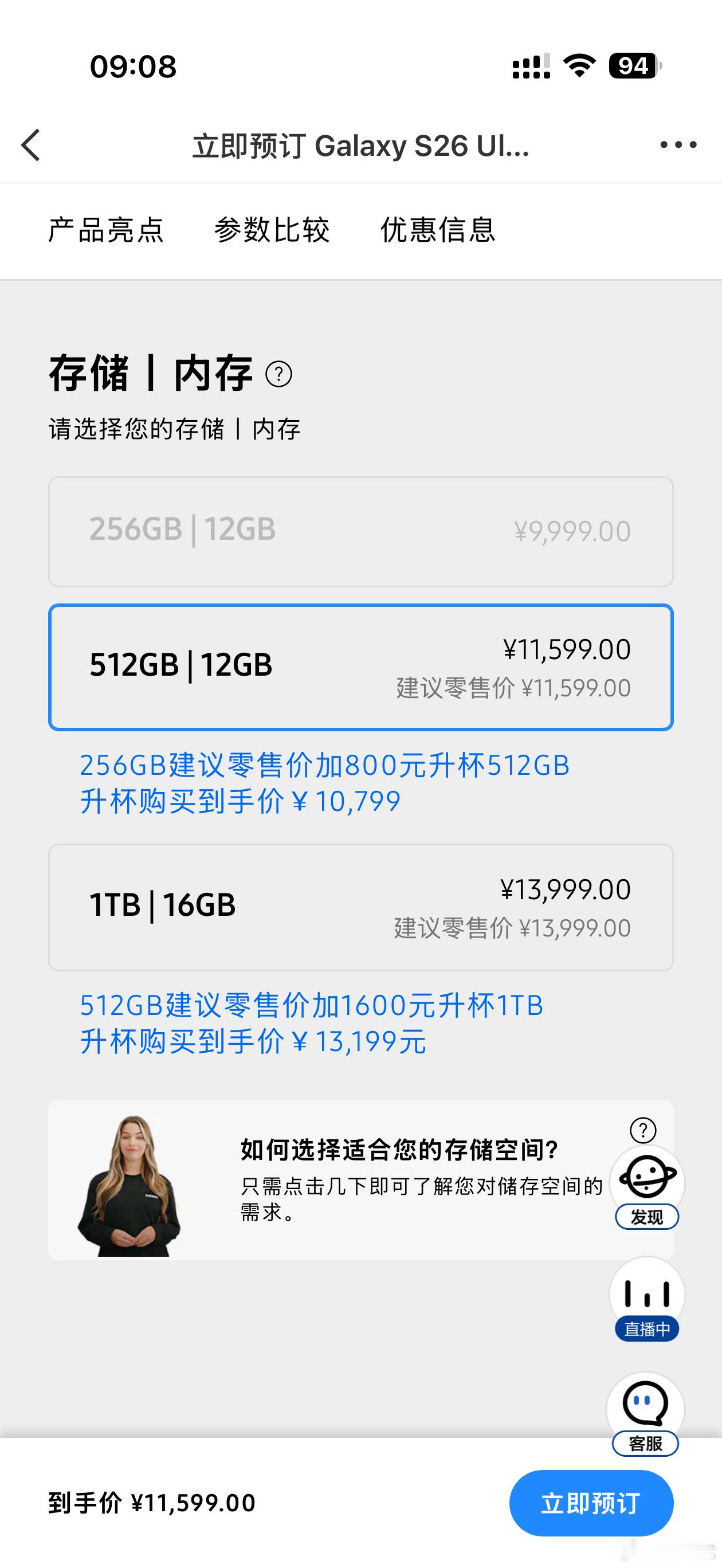 三星Galaxy S26 Ultra:12+256GB 9999元起,加800元升杯512GB,1600元升杯1TB