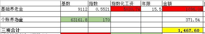 湖北武汉养老金! 武汉的计发基数在湖北最高,达到了9112元,那在武汉灵活就业按照最低档缴15年,退休拿多少? 实例来了! 女性,55岁灵活就业退休,从2009年9月开始缴费,到2026年2月退休,累计缴费15.5年,刚超社保最低年限15年。个人账户本息累计63161.80元,指数0.5521。 这种情况下是不存在过渡性养老金的,养老金的构成只有基础养老金和个人账户养老金。 核定结果: 基础养老金1096.06元,个人账户养老金371.54元,两项合计1467.60元 平均工龄单价1467.6/15.5=95元/年。 看1467元的总数可能觉得不多,换算成单价实际上并不低了。 这个优势是武汉的计发基数给的,倘若换成同样年限同样个账,在湖北其他地方退休,是达不到这个单价的。