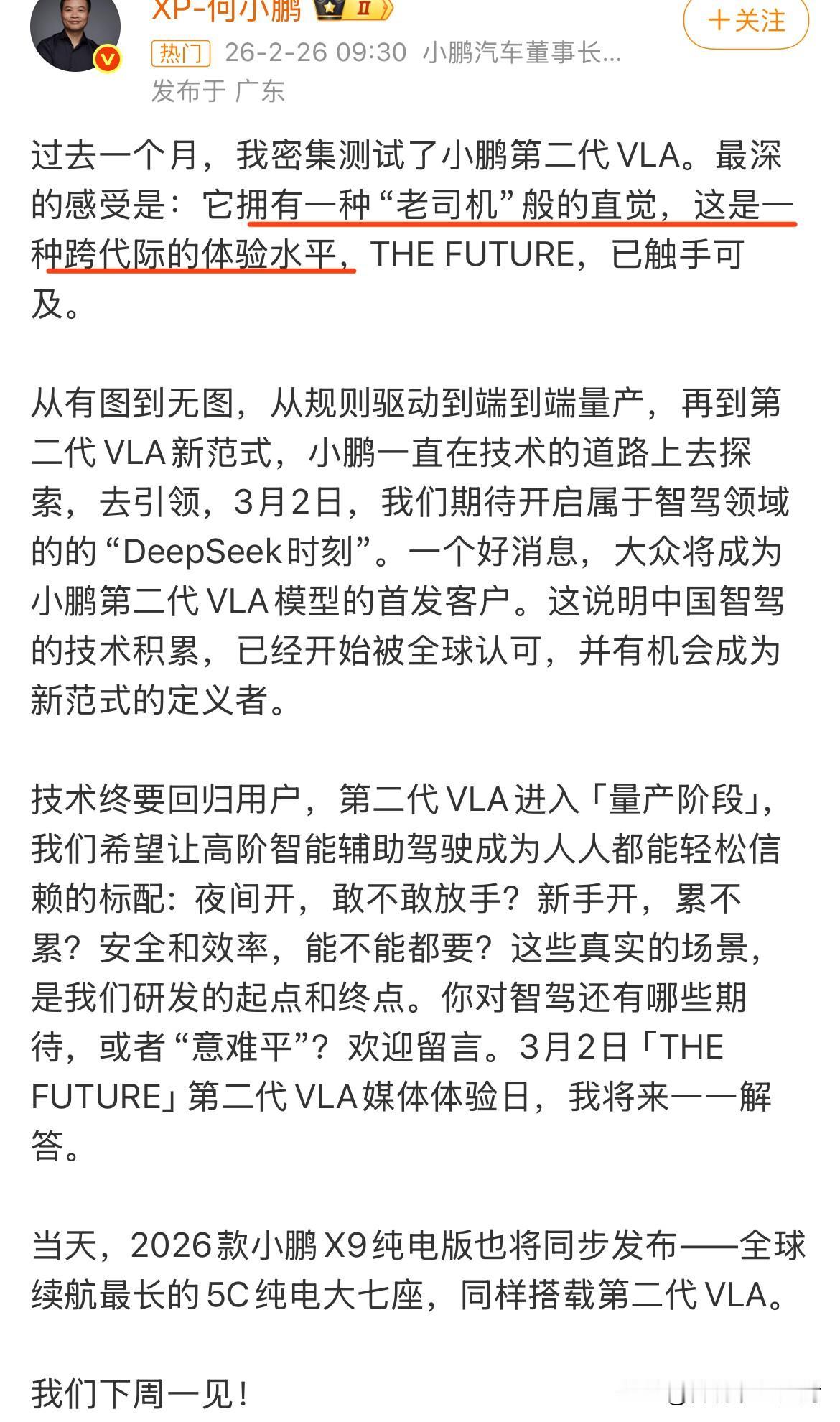 来了!小鹏第二代VLA。 “跨代际的体验水平” 3月2日,媒体体验日,刚好与2026款纯电版X9发布会同一天进行。 何小鹏说“它拥有一种老司机般的直觉,这是一种跨代际的体验水平”。 小鹏的VLA2.0预热了那么久,这次终于要揭开神秘的面纱了…… 第二代VLA对小鹏来说,太重要、太关键了,毕竟是全新范式下的第一个大版本。 何小鹏之前在北美体验FSD V14的时候,说要在2026830追上FSD V14.2在硅谷的整体效果,说实话,定这个目标说明有够自信的。 小鹏的第二代VLA应该也是马年国内智驾领域的第一个大版本,到时候看疗效吧……