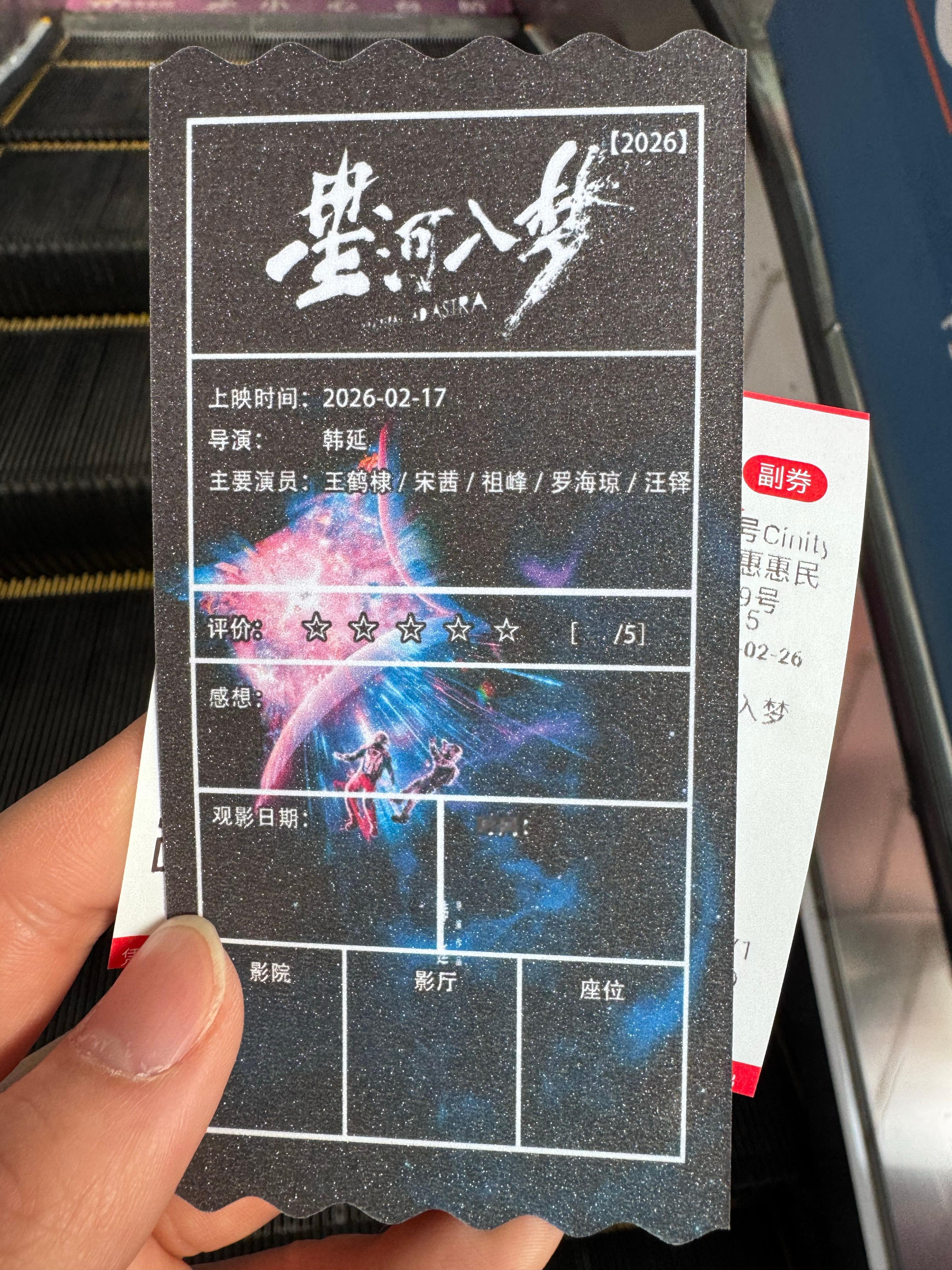 起大早来看《星河入梦》,跑了将近俩小时才到。发现北京这种偏远的影院还真是藏龙卧虎,不光设施不错,C厅里前排有能放躺下的真皮座椅,而且购票也会送自制票根,磨砂表面手感相当不错。周末大家要是没啥事,真的不妨来转转,还有周边拿。春节档马上有戏春节档影评大赛 北京·光耀华纳影城