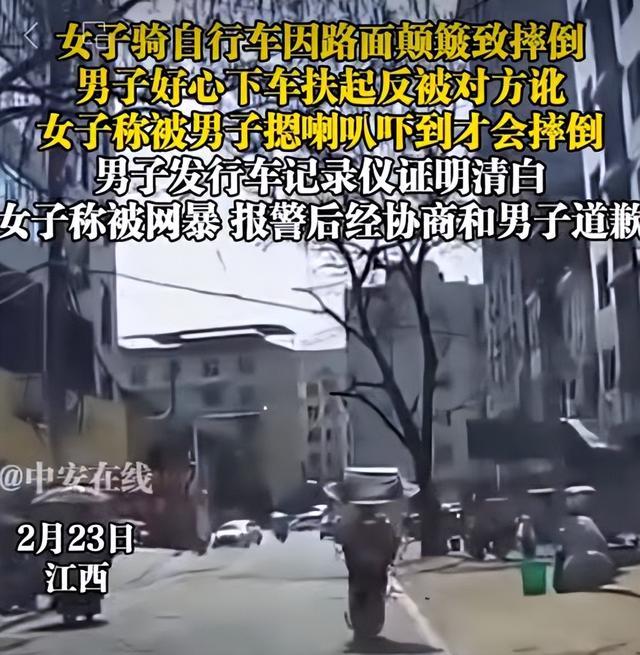 心寒!江西萍乡,好心扶人反被讹,幸好行车记录仪还了清白! 2月23日,江西萍乡,一女子骑自行车因路面颠簸不慎摔倒。 后方男司机好心停车,上前将人扶起,还帮忙扶好车子。没想到女子反咬一口,咬定是被司机按喇叭吓到才摔倒,要求负责赔偿。 司机百口莫辩,万幸行车记录仪拍下全程:车辆未靠近、未鸣笛,女子纯属自行摔倒。铁证面前,谎言被当场戳穿。 最终经协商,女子向司机正式道歉。 一次善举差点蒙冤,一句诬陷寒了人心。 扶人没错,讹人可耻;科技撑腰,正义不缺席! 素材取于网络侵权删除