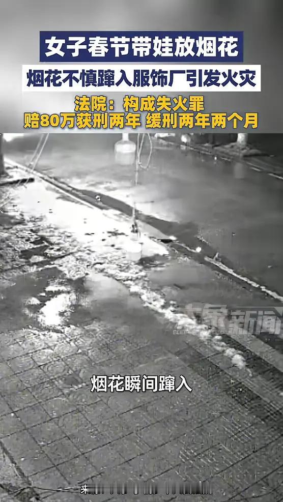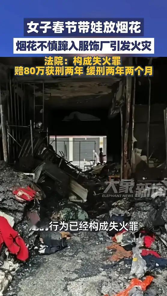 悲剧还是发生了!浙江嘉兴一女子放烟花,赔80万、获刑2年! 浙江嘉兴,一场本是团圆喜庆的春节,却因一支烟花酿成大祸。 女子带儿子燃放烟花,点火瞬间,烟花失控窜进服饰厂仓库,大火迅速蔓延。她奋力扑救无果,慌忙报警仍难挽残局。直接损失80余万元,因失火罪被依法判处有期徒刑2年。 一时侥幸添年味,一念疏忽铸大错。 喜庆变悲剧,平安变牢狱,赔偿百万、身陷刑罚,全家追悔莫及。 网友痛叹:这下真的后悔晚矣! 安全提醒:禁放区不放、易燃区不燃、看管好未成年人,别让欢乐变成灾难,别让年味变成罪与罚! 素材取于网络侵权删除