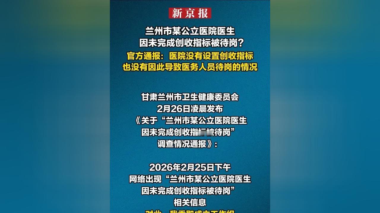 兰州医生待岗事件:创收指标疑云背后,网友怒喊“别让医疗被KPI绑架” 炸锅了!2月25日,一则“兰州某公立医院医生,因没完成每月2.5万创收指标被待岗”的消息,直接冲上热搜,戳中全网怒点! 网友瞬间破防:公立医院的核心是治病救人,还是搞业绩创收?医生的精力该放在患者身上,还是被KPI压得喘不过气?甚至有人吐槽,这背后是不是藏着变相过度诊疗的隐患? 舆论越演越烈,医院连夜回应:没有创收指标,待岗是因为医生违反规章制度。但网友并不买账,质疑声此起彼伏。 直到2月26日凌晨,兰州市卫健委紧急通报,直接锤实:未设创收指标,无因指标待岗情况! 辟谣虽来,但争议未停!大家愤怒的从来不是单一事件,而是怕医疗失去公益底色,怕患者为“创收KPI”买单。公立医院守住底线,才是对医生、对患者最基本的尊重!