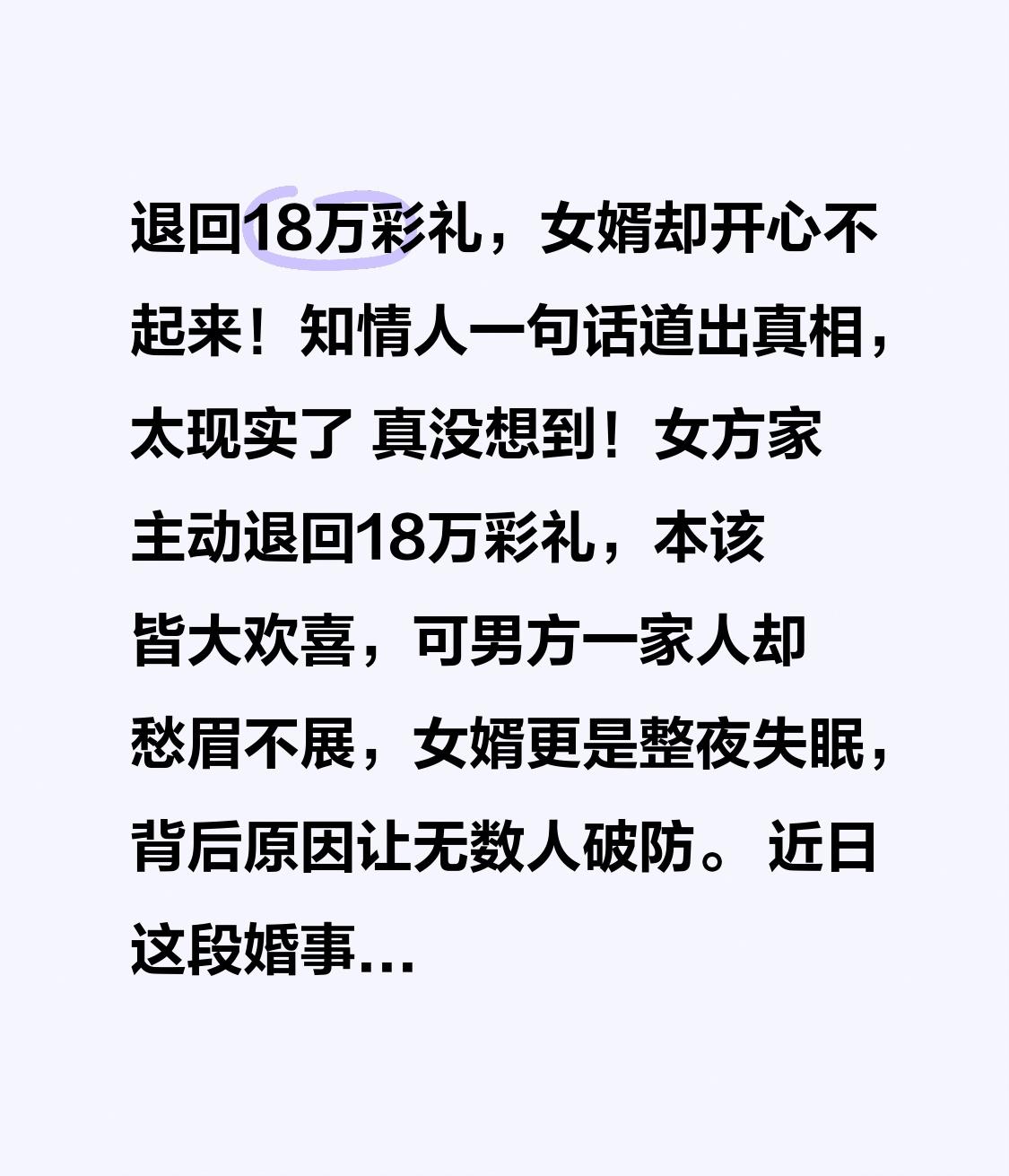 退回18万彩礼,女婿却开心不起来!知情人一句话道出真相,太现实了 真没想到!女方家主动退回18万彩礼,本该皆大欢喜,可男方一家人却愁眉不展,女婿更是整夜失眠,背后原因让无数人破防。 近日这段婚事引发热议:一对年轻人谈婚论嫁,男方东拼西凑借遍亲友,才凑齐十几万彩礼,本以为能顺利成家,结果婚事告吹。好在女方明事理,一分不少把18万彩礼全额退回。 按理说,钱拿回来了,应该松一口气,可现实却狠狠反转。 大家以为男方会拿着这笔钱重新相亲、买车买房,可真实情况是:这笔钱,刚到手就要全部还回去! 原来,当初为了凑彩礼,男方几乎掏空全家积蓄,还向亲戚、朋友、同事借了一大笔。钱退回来,看似是拿到了18万,实际上只是**“左手进、右手出”**,一分都留不下,刚到账就要立刻拿去还债。 女婿经济状况本就不好,退回的彩礼还清外债后,依旧一穷二白,没房、没车、没存款,年纪不小,婚事黄了,外债是清了,但未来依旧一片迷茫。 网友看完都心疼: “以为是反转,结果是现实。” “彩礼退了,人没了,家还是空的。” “不是不想幸福,是真的太难了。” 这件事戳中了多少普通家庭的痛: 不是不想娶媳妇,是天价彩礼真的扛不住; 不是不想好好过日子,是起步太难、压力太大。 很多农村普通家庭,为了孩子结婚,父母半辈子的积蓄掏空,还要拉下脸到处借钱,一场婚结下来,全家返贫。 钱可以退回,青春退不回;债可以还清,心里的苦难抹平。 真正的幸福,从来不是靠彩礼堆出来的。愿少一点攀比,多一点体谅;愿每一个努力生活的普通人,都能被生活温柔以待,不用再为彩礼压弯脊梁。