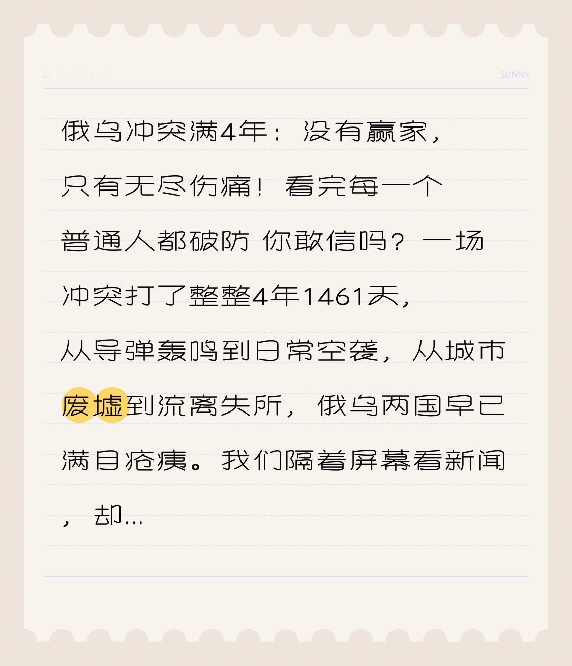俄乌冲突满4年:没有赢家,只有无尽伤痛!看完每一个普通人都破防 你敢信吗?一场冲突打了整整4年1461天,从导弹轰鸣到日常空袭,从城市废墟到流离失所,俄乌两国早已满目疮痍。我们隔着屏幕看新闻,却不知道,那里的普通人,正活在人间炼狱里。 2026年2月24日,俄乌冲突迎来四周年。本以为会迎来和平曙光,现实却狠狠打脸:俄军密集空袭能源设施,基辅、敖德萨大面积断电断暖;乌军在南部小幅推进,双方伤亡逼近180万,最年轻的阵亡士兵才20岁。前线胶着、后方煎熬,这场消耗战,没有尽头。 转折点扎心又残酷:战争从来没有赢家,只有受苦的平民。乌克兰千万人口流失,数百万留守者在寒冬里靠水车取水、摸黑取暖;俄罗斯承受西方制裁,经济承压,无数家庭失去亲人。医院被炸、学校停课、家园成废墟,孩子的童年被炮火吞噬,老人在寒风中等一碗热汤。 曾经繁华的马里乌波尔,如今只剩断壁残垣;本该读书的少年,扛起枪走向战场;本该安享晚年的老人,被迫逃离故土。联合国数据刺痛人心:超600万乌克兰难民流亡国外,370万人流离失所,平民伤亡持续攀升,老人、孩子成了最无辜的牺牲品。 有人问,还要打多久?没人知道。政客谈判、大国博弈,可买单的,永远是普通百姓。我们总觉得战争很遥远,可在俄乌,明天和意外,永远不知道哪个先来。 这世上最珍贵的,从来不是领土与利益,而是灯火可亲、家人闲坐、平安无恙。我们生在和平的国家,不是没有战争,而是有人守护着岁月静好。 愿战火早日熄灭,愿流离者归家,愿每一个生命都被温柔以待。别再歌颂战争,和平,才是人类最奢侈的幸福。
