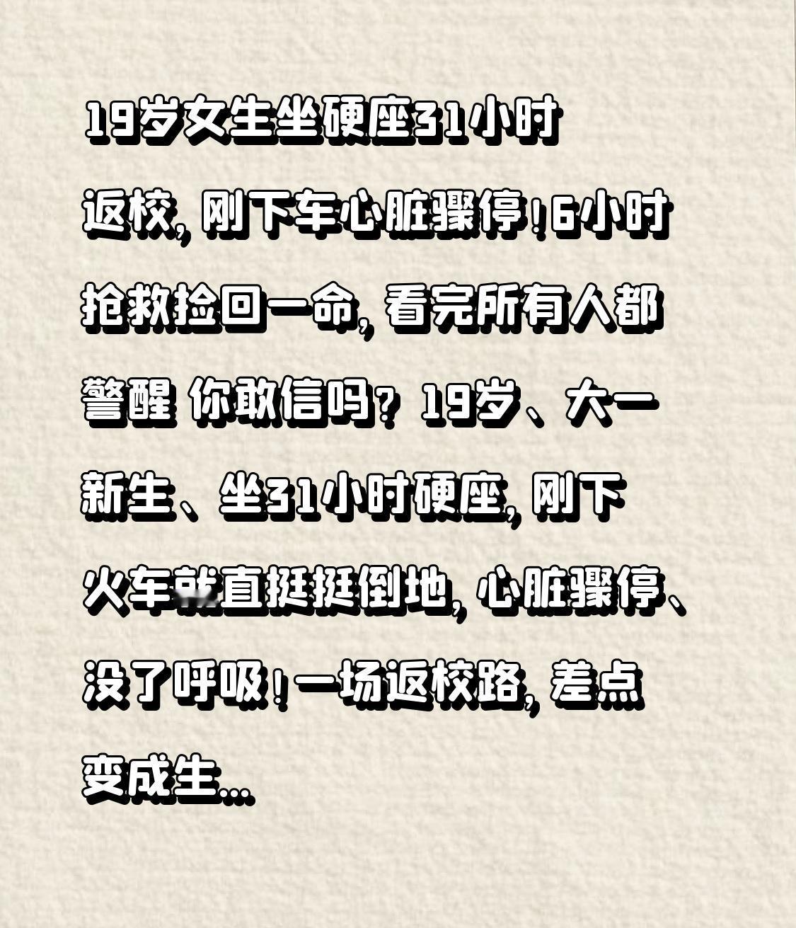 19岁女生坐硬座31小时返校,刚下车心脏骤停!6小时抢救捡回一命,看完所有人都警醒 你敢信吗?19岁、大一新生、坐31小时硬座,刚下火车就直挺挺倒地,心脏骤停、没了呼吸!一场返校路,差点变成生死劫,真相让无数家长和学生破防。 近日广东东莞东站,凌晨5点多,从成都出发的大一女生小艾,熬完近31小时硬座,终于到站。她拖着行李箱刚走几步,突然眼前一黑栽倒在地,脸色惨白、四肢冰凉,脉搏和呼吸瞬间消失。车站工作人员冲过来,立刻心肺复苏、AED除颤,120呼啸着送进医院。 急诊室里,医生与死神赛跑整整6小时,溶栓、监护、全力抢救,才把这个年轻生命从鬼门关拉回来。所有人都以为是先天性心脏病,结果诊断出来,所有人都惊呆了:急性肺栓塞,俗称“经济舱综合征”! 更让人心疼的是转折:小艾出发前已经胸闷两天,明明身体发出警报,却怕耽误开学、怕花钱、怕给家里添麻烦,硬是硬扛着上了车。31小时里,硬座空间狭小,她几乎全程不动、喝水少、休息差,下肢静脉悄悄形成血栓,一下车活动,血栓脱落堵死肺动脉,直接诱发心脏骤停。 年轻、能扛、省钱,成了最致命的陷阱。很多学生党都觉得自己身体好,长途硬座忍一忍就过去,为了省几百块票钱,连坐十几二十小时是常态。可没人告诉你:久坐不动=静脉血栓=猝死风险,年轻人一样会中招。 医生反复提醒:长途出行别硬撑!每1小时起身走动、拉伸双腿、多喝水,身体不舒服立刻停,别拿命赌前程。开学重要、省钱重要,都比不上活着重要。 这件事戳中无数人:我们总为了赶路、为了省钱、为了懂事,把自己逼到极限。可父母要的不是你拼命省钱,不是你准时报到,是你平平安安站在他们面前。 别再让懂事变成伤害,别让年轻成为侥幸。转给身边要返校、要长途出行的人,平安,才是最贵的车票。