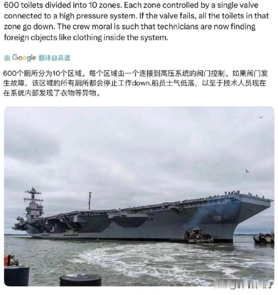 航母厕所炸了!! 2月23日美军福特号航母紧急停靠希腊苏达湾,原定中东部署计划直接推迟,原因居然是全舰厕所大规模瘫痪!650个厕所近9成无法使用,舰上四千多名人员如厕排队超40分钟,舱内污水淤积,臭气弥漫,场面彻底失控。 这艘造价130亿的先进航母,厕所系统早有设计硬伤。摒弃传统集中式设计改成分布式布局,却为省成本让每个厕所蹲坑共用一套负压抽取装置,还照搬民航真空排污系统,窄径管道根本扛不住航母高强度使用。全舰厕所分10个区域串联,一个阀门故障就整区瘫痪,异物堵塞更是家常便饭。 更离谱的是维修难度拉满,管道只能靠港酸洗疏通,单次成本40万美元,海上根本没法修。舰员士气低落到故意往系统扔衣物泄愤,故障连锁反应根本止不住,好好的海上巨兽,愣是栽在了厕所这事上。