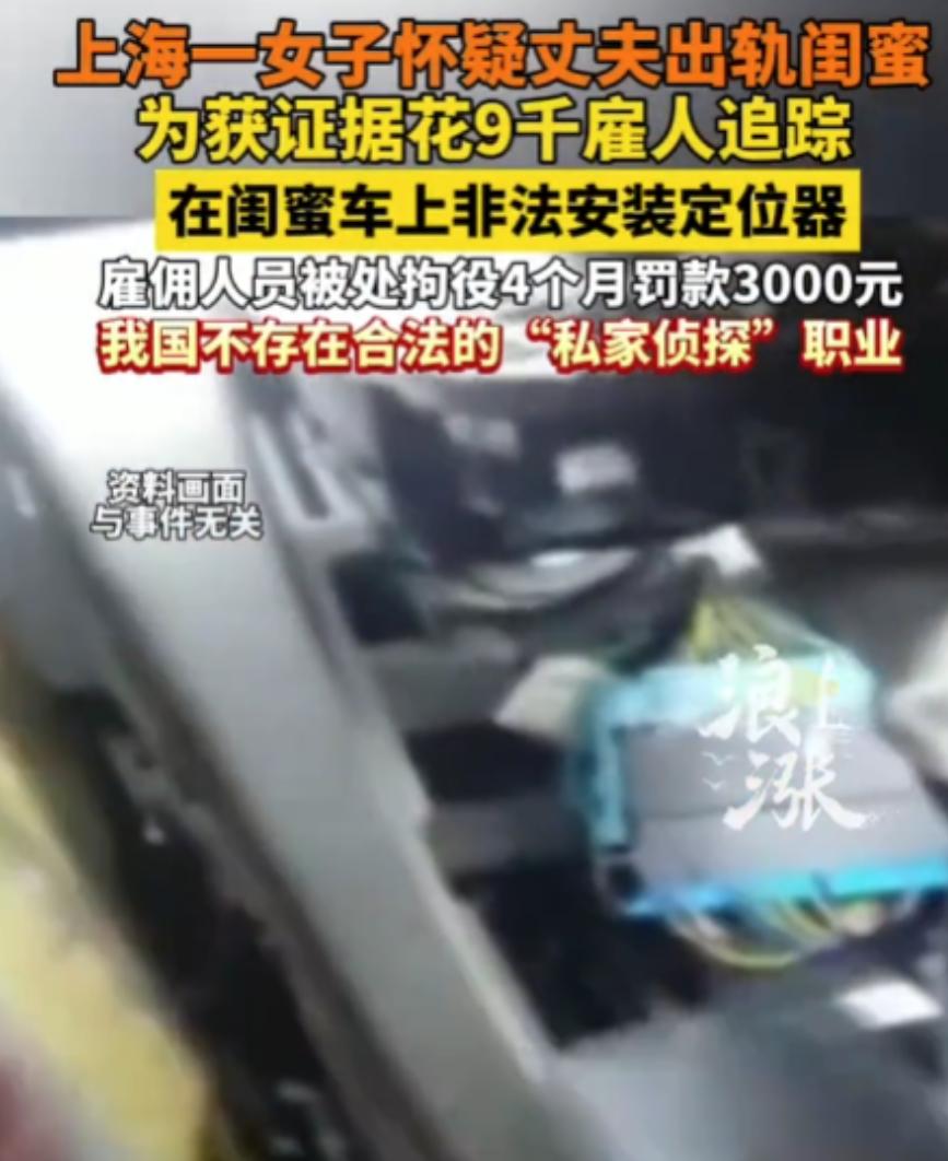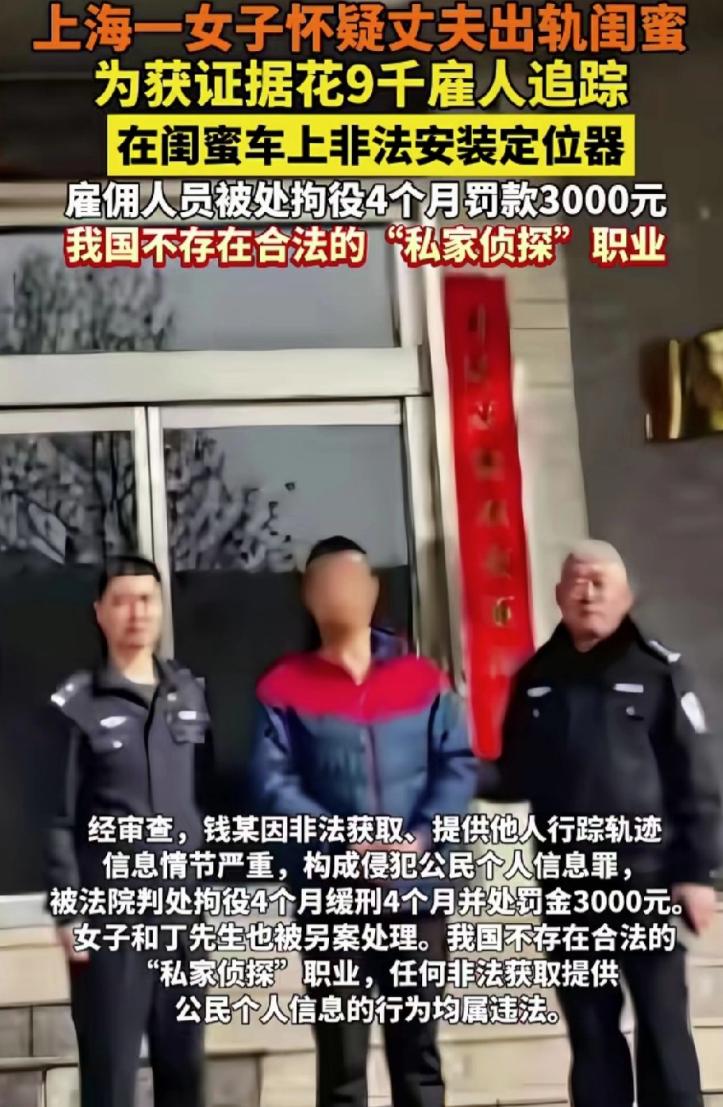 这下闺蜜没得处了!上海,女子总觉得丈夫有事瞒着自己,在外面有人,而她怀疑的目标正是自己的闺蜜,苦于没有证据,就花9000块雇了两个私家侦探,结果证据没找到,还GPS的时候还被闺蜜发现,闺蜜直接报了警 这两年总觉得家里气氛不对。老公回家越来越晚,手机跟宝贝似的捂着,对她也是爱搭不理。更要命的是,她发现老公跟自己闺蜜刘小姐走得太近了,俩人说说笑笑的样子,怎么看怎么不对劲 可怀疑归怀疑,手里没证据啊。陈女士心里这个煎熬,白天想晚上想,总觉得老公肯定有事瞒着她。最后她一咬牙,花了9000块钱,找了个所谓的私家侦探 这侦探姓丁,收了钱立马找了帮手钱某。俩人一合计,决定在刘小姐车上动手脚。第一次是装了个磁吸的GPS定位器,藏在车底。从那以后,刘小姐的车去过哪、停了多久,陈女士手机上看得一清二楚 定位器用久了信号不太行,陈女士又加钱,前前后后花了9000块。钱某不仅换了新设备,还亲自去刘小姐常去的地方蹲点,想拍点能当证据的照片。可跟了两个月,啥也没拍着,刘小姐的生活轨迹正常得不能再正常 2021年7月,定位器又坏了。钱某趁着夜色偷偷摸摸去换,刚蹲在车边捣鼓,刘小姐正好下楼取车,一眼看见车底有人,当场把他堵住,直接报了警 这一下可热闹了。警察一查,钱某非法获取他人行踪轨迹,情节严重,构成侵犯公民个人信息罪,被判拘役4个月缓刑4个月,罚金3000。陈女士和那个丁先生也被另案处理了 这事说起来挺唏嘘的。陈女士本想查个真相,结果闺蜜没处成,自己还惹上了官司 信任这东西,一旦裂了缝,补起来是真难。陈女士怀疑丈夫和闺蜜,按理说也不是完全没理由,毕竟生活中这种狗血剧情确实上演过。但她选择的方式,直接把事情推向了不可收拾的地步 再说那个私家侦探。很多人不知道,在中国,私家侦探这个行当其实是灰色的。跟踪、偷拍、装定位器,这些在电影里看着很酷的操作,现实中分分钟踩红线。行踪轨迹属于个人信息,非法获取是要吃官司的 还有刘小姐,莫名其妙被闺蜜怀疑,被陌生人跟踪,车上还被装了定位器。就算她真跟陈女士丈夫没什么,这事一出,这闺蜜情分也彻底凉了。换谁心里能舒服? 其实陈女士这种心态,很多人多少能理解。感情里一旦有了猜忌,就像心里长了根刺,不拔出来难受,拔又不知道怎么拔。可问题是,用违法的手段去找真相,本身就是个坑。真查出什么,自己也进去了;查不出什么,对方知道了更没法收场 感情的事,要么当面谈清楚,要么干脆认了。用这种见不得光的手段,最后往往是伤敌八百,自损一千 女子怀疑丈夫出轨闺蜜花9千雇人跟踪
