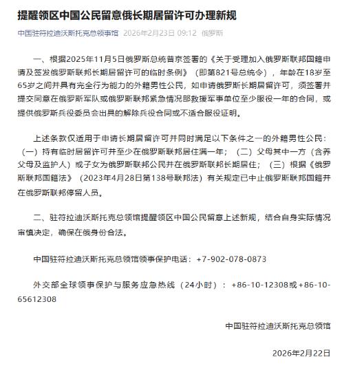 大俄开始抓人了?2月23日,中领馆紧急提醒:根据普京在2025年11月5日签署的第821号总统令,18-65岁在俄长期居留男性,须同意在俄军事单位等至少服役1年。明眼人都能看出来,这哪里是办理居留的条件,这就是战场伤亡太大,没人可补,只能抓外国人来填战壕。 再看这项规定的针对性极强,不是泛泛而谈。只要是18至65岁、有完全行为能力的外籍男性,持有临时居留许可在俄住满一年,或者父母、子女是俄公民,又或是曾经放弃俄国籍的人,全都在这个强制兵役的范围里。 中国驻符拉迪沃斯托克总领馆特意发文提醒,就是怕咱们在俄的同胞看不懂背后的风险,稀里糊涂签了字,转头就被送上俄乌前线。 过去咱们总说,出国在外平安是福,可现在俄罗斯直接把居留权和战场绑定,等于把平安的门槛,变成了一道鬼门关。 为什么俄罗斯会突然出台这么极端的政策? 答案只有一个:俄乌冲突打到现在,人员消耗已经到了难以为继的地步,本土兵源彻底顶不住了。 从2022年冲突全面爆发至今,俄罗斯先后动用了正规军、预备役、瓦格纳雇佣兵,甚至把监狱里的囚犯都拉上了战场,可依旧填不满前线的伤亡窟窿。 最典型的就是巴赫穆特战役,瓦格纳集团从俄罗斯监狱里招募了近5万名囚犯兵,承诺服役半年就能减刑赦免,结果一场仗打下来,有超过1.7万名囚犯兵当场阵亡,伤亡比例高得触目惊心。 这些囚犯兵被当成一次性炮灰,发起人肉冲锋,第一波冲上去的人死亡率能达到80%,很多人连敌人的影子都没看到,就倒在了炮火之下。 瓦格纳事件之后,囚犯兵的路子走不通了,俄罗斯只能把目光转向外籍人士,用居留权当诱饵,继续寻找可以送上战场的人力。 为了凑够前线兵员,俄罗斯的征兵底线一降再降,已经到了不择手段的地步。 此前有媒体曝光,俄军甚至把截肢受伤、失去作战能力的伤员强行送回前线,征兵年龄不断放宽,从原本的适龄青年,直接拉到18岁到65岁,几乎把能扛枪的男性全都纳入征召范围。 本土动员已经触及社会承受底线,再大规模征召本国公民,很容易引发国内动荡,俄罗斯当局很清楚这一点,所以才把算盘打到外籍长期居留人员身上。 这些外籍人士为了在俄生活、工作、做生意,对长期居留许可有刚需,俄罗斯正是抓住这个心理,用一纸居留证,换你一年的战场卖命 中国驻俄总领馆第一时间发布提醒,是对咱们同胞最负责的保护。 很多在俄罗斯的中国公民,为了拓展生意、方便生活、照顾家人,迫切需要一张长期居留许可,这本是很正常的需求。 可他们不知道,现在俄罗斯的居留许可,已经和俄乌战场的生死风险绑在了一起。 18到65岁,正是一个男人上有老下有小的年纪,为了一张居留证,把自己送到枪林弹雨里,一旦出事,整个家庭都会崩塌。 而且一旦签署兵役合同,就没有反悔的余地,俄罗斯军方不会管你是中国人还是其他国家的人,合同生效,立刻送往前线,到时候想回国、想逃脱,根本没有任何可能。 在这里,再次提醒所有在俄的中国同胞,尤其是18至65岁的男性公民,一定要把总领馆的提醒刻在心里,审慎做出决定,千万不要被居留权迷惑双眼,不要做拿命换身份的冤大头。 合法居留很重要,但平安回家、和家人团聚,才是最值得珍惜的事情。 战争是残酷的,俄罗斯的新规已经把战场的窘迫暴露无遗,咱们普通人没必要为了他国的战事,搭上自己的一生。 中国驻俄领馆始终把同胞的安全放在第一位,及时发布风险提示,就是为了让大家远离危险。 希望每一位在俄的中国人都能保持清醒,认清这项政策背后的生死风险,守住安全底线,平平安安地生活,安安全全地回家。 别等到踏上战场才后悔莫及,到那时,一切都晚了。