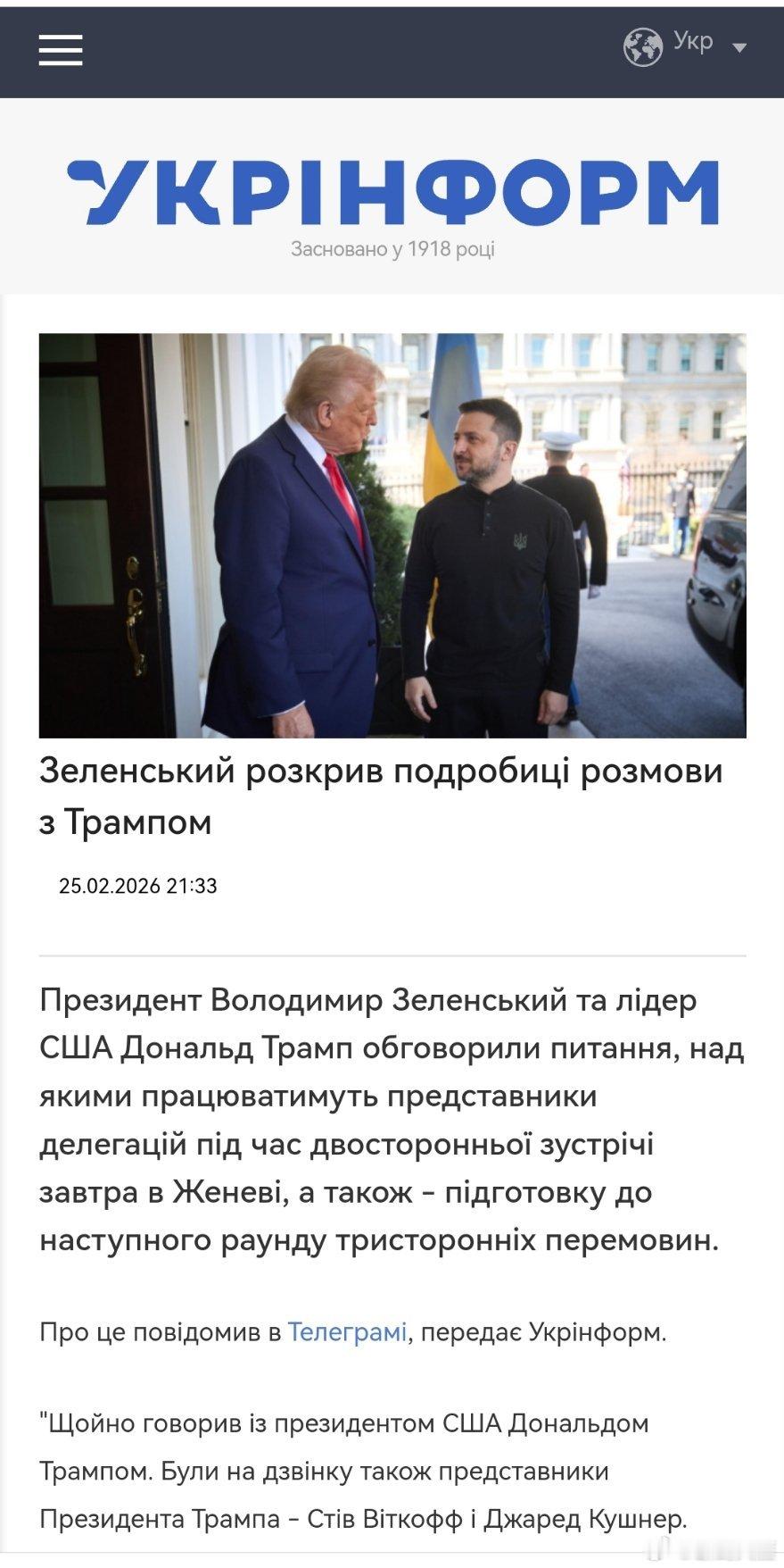 据乌克兰国家通讯社(Ukrinform)报道,乌克兰总统弗拉基米尔·泽连斯基与美国总统唐纳德·特朗普讨论了双方代表团在明天于日内瓦举行的双边会谈中将要探讨的议题,以及为下一轮三方谈判所做的准备工作。该消息由泽连斯基在Telegram上发布。(乌克兰在线新闻网)