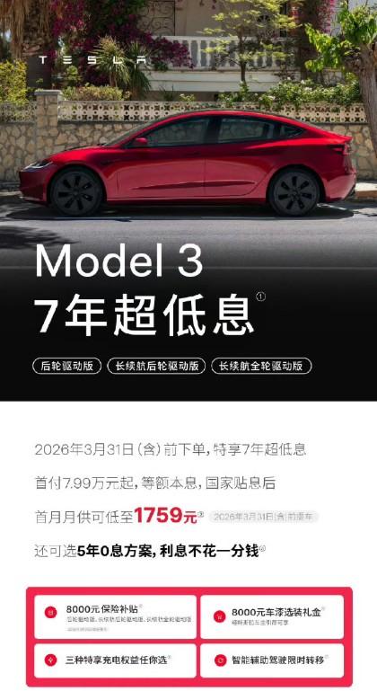 特斯拉这波7年低息、5年免息,从1月底延到3月底,已经是第二次续命了。 说白了,就是车不好卖。去年全球销量跌了8.6%,中国区也在下滑。虽然一直喊着要转型AI,但主业汽车这现金流快撑不住脸面了 。 购置税补贴一退坡,消费者得多掏钱,只能靠拉长贷款、降低月供来勾人下单。直接降价伤品牌,玩金融算是遮羞布。 友商们也没闲着,小米、小鹏的政策大多到2月底,比着卷。接下来两周,肯定还有一堆品牌咬着牙宣布“限时跟牌”,这波怕是要打到二季度。【来自懂车帝车友圈】