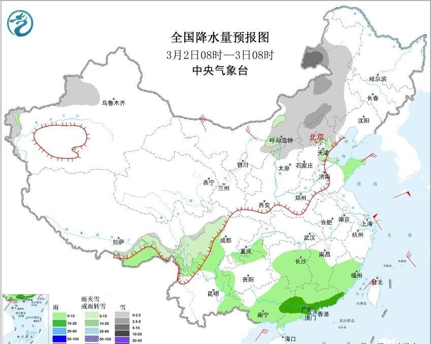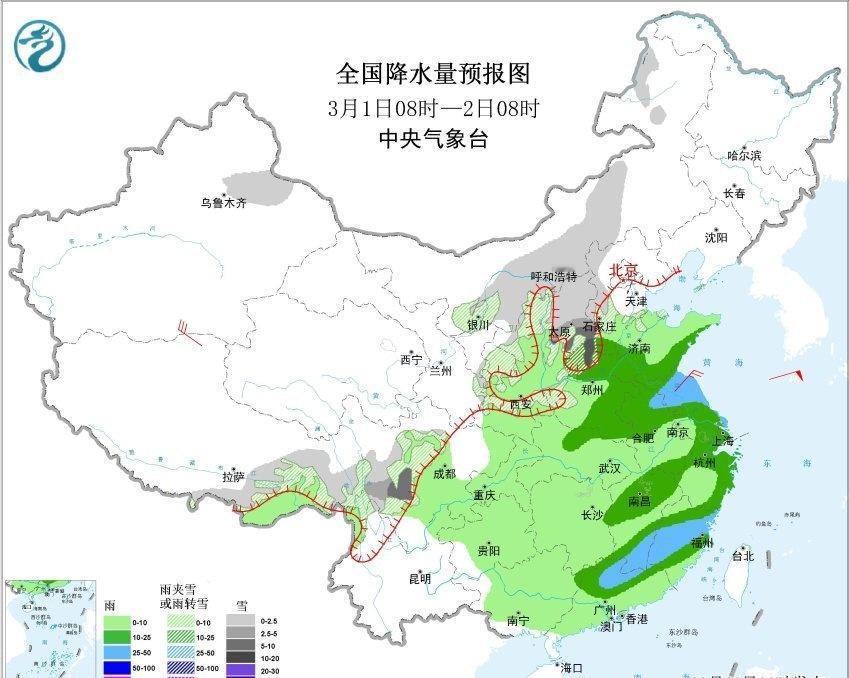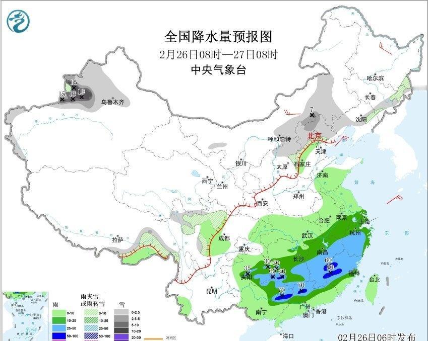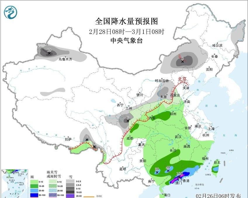 【雨雪】昨天到今晨,内蒙古东部和黑龙江西部等地出现降雪,加格达奇出现暴雪。今晨8时积雪,加格达奇48厘米,创观测史最深积雪纪录,嫩江56厘米追平昨天创的观测史最深积雪纪录,黑河爱辉区55厘米创2月最深积雪纪录,满洲里43厘米处于纪录水平附近(2月22日刚创的44厘米观测史纪录)。 昨天到今晨,黄河以南的降雨发展增强并向东推进。江西湖南河南安徽部分站点出现大雨,对应低空有切变线辐合。从对流监测看,在湖南北部、湖北、河南南部、安徽西部、江西北部,出现雷电。在湖南南部和江西南部的暖湿输送带上,出现暖区对流,部分地区出现了短时强降雨。 今天内蒙古东部和黑龙江大部的降雪结束。今天到明晨,内蒙古中部、山西北部、河北北部、北京、辽宁部分地区、吉林东部可能有降雪或雨夹雪。今后3天新疆天山西段持续受到北侧上游冷涡影响,会出现大雪-暴雪,要警惕强降雪导致的积雪、结冰对交通和农牧业的不利影响。 另外今后5天南方的降雨依然频繁。今明2天,降雨区呈现南落趋势。今天在江南南部和华南北部,还有成片的大雨,局地暴雨。明天总体雨势减弱,但广东如果出现暖区对流,还有大雨-暴雨。后天依然类似,广东中南部如果在偏南气流里出现暖区对流,不排除局地有大暴雨。 此外2月28日-3月1日,暖湿气流北上,西北地区东部、华北、黄淮也可能出现降水。在降水区北段的甘肃陕西山西河北等地,雨雪相态复杂。临近根据低空温度判定雨雪分界线,以及降雪强度。如果转雪时间早,雨雪比例中,降雪占比高,3月1日在太行山附近有可能明显降雪。