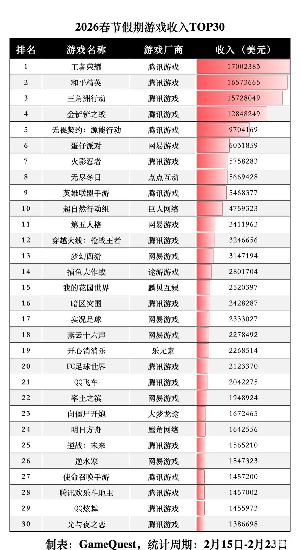 春节档最赚的游戏榜单出炉,腾讯霸榜!前十有7款是腾讯的,《王者荣耀》卖皮肤卖爆了,收入1700万美元。网易《蛋仔派对》靠联动进前十,整个榜里看不到二游的影子,腾讯稳得很~