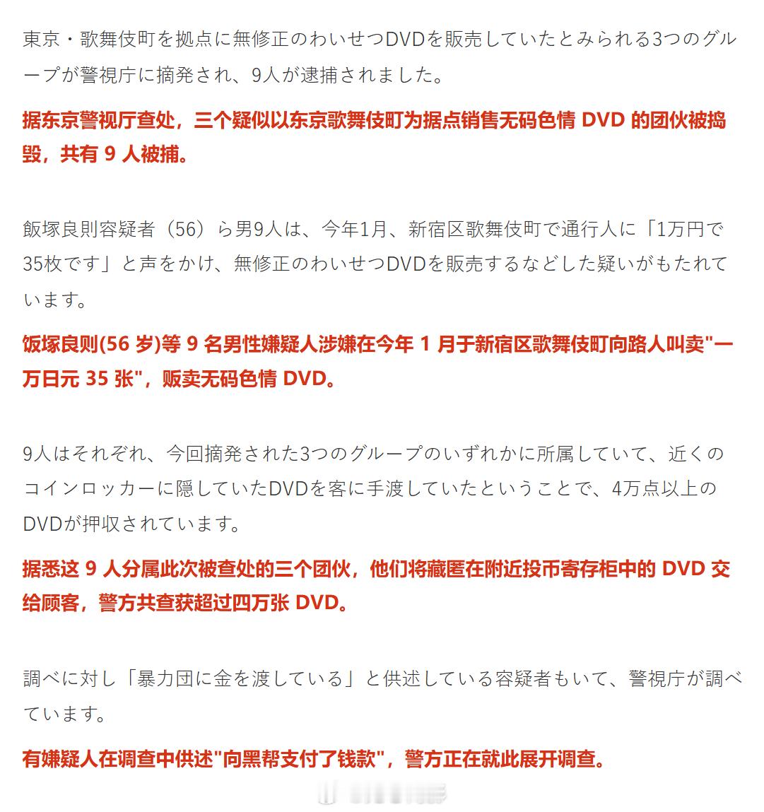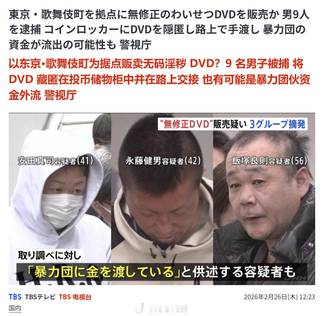 日本这个新闻里的槽点虽然不多,但足够典。作为性产业大国,AV闻名全球,失足女满大街,大久保公园都红过一头成为过去式了,未成年人都用软件来接“爸爸活”了,而这几个人却因为贩卖无码瑟琴DVD被捕,你日的小黄片都拍出世界纪录了,那点码到底打了有啥用?(我知道是日本法律)更关键是,都2026年了,他们卖片居然还是在街头叫卖DVD碟片这种古老的方法……不过跟传真机、3寸软盘一比……好吧,还是要“先进”一些