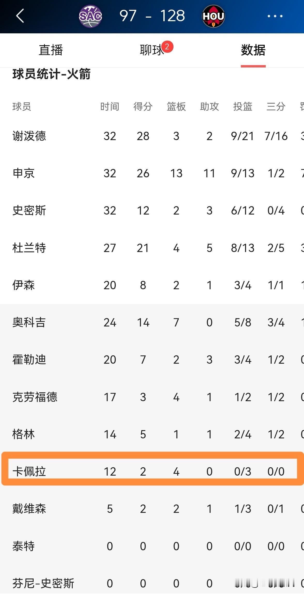 火箭中锋卡佩拉的篮下终结能力真是太糟糕了!在今天火箭主场以128:97大胜国王的比赛中,卡佩拉将自己糟糕的篮下终结能力展现的淋漓尽致。 整场比赛下来,卡佩拉替补出战12分钟,投篮3中0,仅仅依靠罚球得到2分,不过有4篮板1盖帽,他的场上正负值为+19。 老实讲,卡佩拉在亚当斯赛季报销的情况下依然无法获得更多的上场时间,其中的一个重要原因就是他的进攻能力太差了。