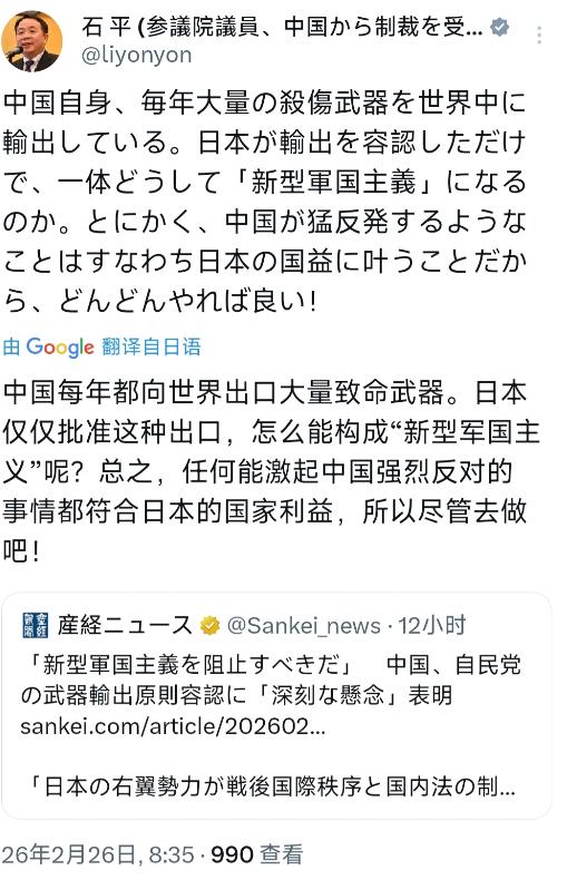 日本参议员、汉奸石平今天(2月26日)写道:“中国每年都向世界出口大量致命武器。日本仅仅批准这种出口,怎么能构成‘新型军国主义’呢?总之,任何能激起中国强烈反对的事情都符合日本的国家利益,所以尽管去做吧!” 【石平转发了产经新闻的报道:“应阻止新型军国主义”——中国对自民党认可武器出口原则表示“严重关切”】 日本自民党2月25日刚通过扩大防卫装备出口范围的提案,就被石平拿来当攻击中国的工具。这份提案明确要废除此前仅限救援、运输等五类非战斗装备的出口限制,原则上允许对外输出战斗机、护卫舰这类具有杀伤能力的武器,甚至为向正在发生战斗的国家出口留足了空间。 这样的举动根本不是简单的“批准出口”,而是彻底撕毁日本战后坚守多年的和平底线,是在“切香肠”式突破和平宪法的约束。 中国从来没有所谓“出口大量致命武器”的情况,中国的军贸政策始终坚守负责任的底线。中国只与主权国家开展军贸合作,严格遵循有助于接受国正当自卫、不损害地区和平稳定、不干涉他国内政的三项原则,所有出口都有严格的法律监管和最终用户核查机制。 反观日本,二战后原本有“武器出口三原则”的严格限制,却从2014年开始用“防卫装备转移三原则”替代,一步步放宽限制,如今更是要全面放开致命武器出口,这种持续突破的动向本身就充满危险。 石平故意混淆中日武器出口的本质区别,说白了就是为日本右翼的军国主义倾向站台。中国外交部发言人毛宁25日已经明确表示,由于侵略历史,日本的军事安全动向一直备受亚洲邻国和国际社会关注。 近年来日本大幅调整安保政策,官员公开鼓噪“拥核”,谋求修改“无核三原则”,现在又要取消武器出口限制,这些举动都暴露了其突破战后国际秩序、谋求“再军事化”的野心。国际社会对这种动向保持警惕、中国表达严重关切,完全是合情合理的正当反应。 石平声称“任何能激起中国强烈反对的事情都符合日本的国家利益”,这种论调既荒谬又危险。日本的国家利益从来不该建立在挑衅邻国、破坏地区和平的基础上,更何况日本国内已经有大批民众站出来反对。 2月24日晚,东京就有民众集会抗议高市早苗政府推动修宪、扩充军备的政策,他们举着“反对修宪”“不要战争”的标语,明确表达了对军国主义复活的担忧。石平作为日本参议员,无视本国民众的和平诉求,一味鼓吹对抗,本质上就是在将日本推向危险的边缘。 中国的武器出口份额和流向都有明确数据支撑,即便近年来军贸规模有所增长,也始终用于维护相关国家的正当自卫能力,从未像石平污蔑的那样“出口大量致命武器”。 而日本放开致命武器出口后,很可能将武器销往冲突地区或中国周边国家,加剧地区军备竞赛,这才是对全球和平稳定的真正威胁。石平之所以抛出这种颠倒黑白的言论,不过是因为他的政治生涯完全依附于日本右翼势力,靠发表反华言论博取关注、稳固地位。 这位曾窜访台湾并宣称“台湾与中国无关”的政客,早已丧失了基本的良知和底线。他的言论不仅违背事实,更忽视了日本侵略历史给亚洲各国带来的深重灾难,忽视了国际社会对军国主义复活的高度警惕。 日本如果真的按照石平的荒谬逻辑行事,执意推进武器出口松绑,最终只会遭到周边国家的联合反制,让自己陷入孤立境地。 历史已经证明,军国主义道路从来没有好下场,石平的鼓噪和日本右翼的危险动向,只会让世界更清晰地看清其真实面目,也让所有热爱和平的力量更加坚定地站在一起,捍卫战后国际秩序和地区和平稳定。