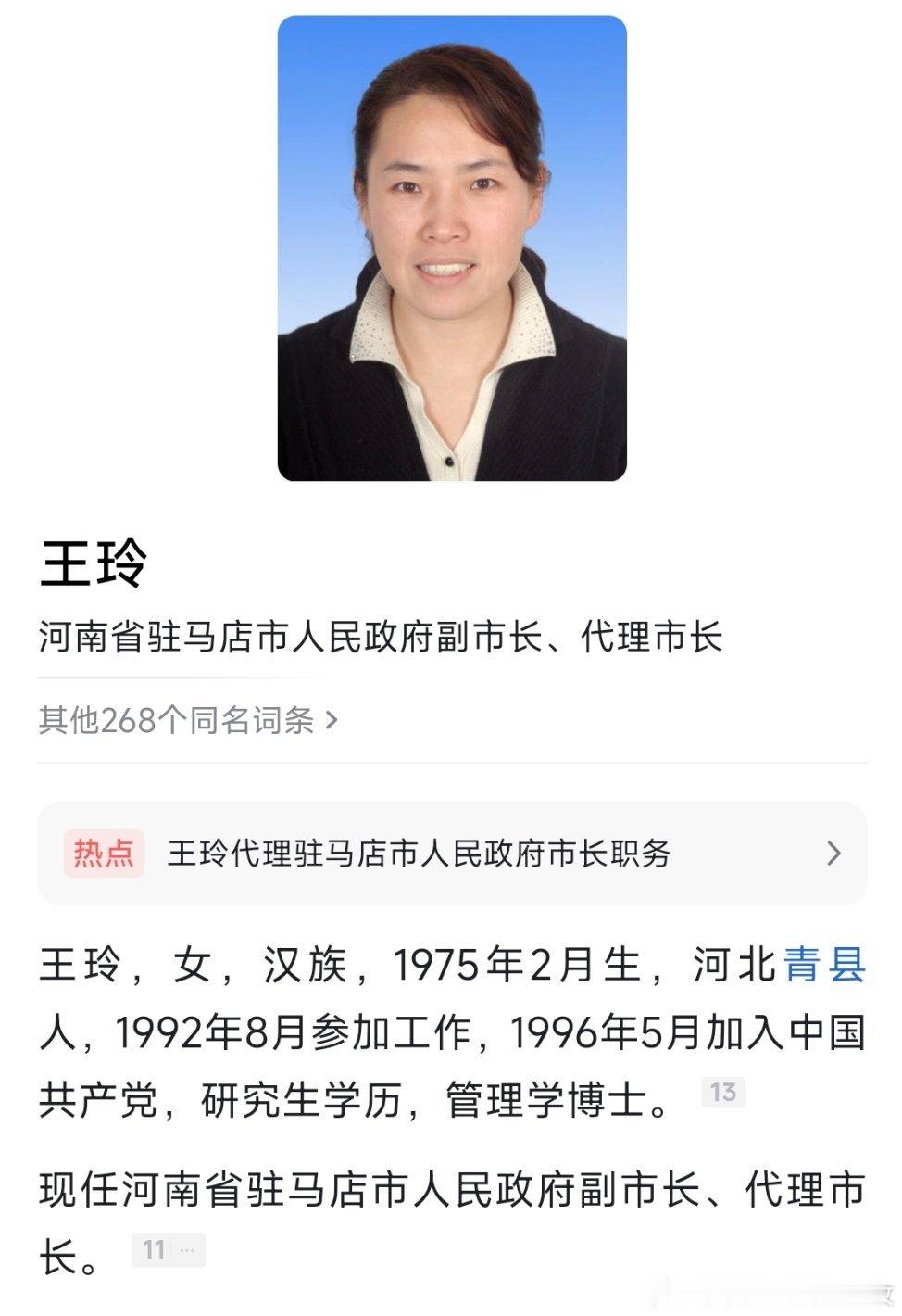 王玲任驻马店市副市长、代理市长。