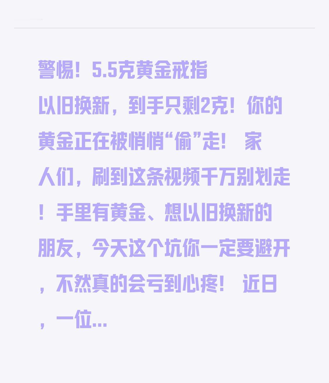 警惕!5.5克黄金戒指以旧换新,到手只剩2克!你的黄金正在被悄悄“偷”走! 家人们,刷到这条视频千万别划走!手里有黄金、想以旧换新的朋友,今天这个坑你一定要避开,不然真的会亏到心疼! 近日,一位女士拿着自己5.5克的足金戒指,去金店以旧换新,满心欢喜想换个新款戴,结果换完回家一称,新戒指竟然只有2克!将近一半的黄金不翼而飞,女士当场傻眼,找商家理论,却被各种套路话术搪塞,这口气实在咽不下去! 相信很多人都有过黄金以旧换新的经历,觉得旧金放着不戴浪费,换个新款时尚又划算,可你不知道,这里面的水,深到超乎想象! 很多金店打着“免费换新”“折价换款”的旗号,看似让利消费者,实则藏着猫腻。他们不按克重计价,而是主推一口价黄金、3D硬金、5G黄金,这些黄金款式好看、工艺费极高,却不标注重量,用“好看”“时尚”掩盖克重缩水的事实。 这位女士就是被导购忽悠,放弃了按克重换款,选择了一口价戒指,全程没被告知新金的重量,等发现时,已经晚了。5.5克变成2克,相当于白白损失了3克多黄金,按现在的金价算,直接亏了近两千块,这可是普通人好几天的工资! 更气人的是,部分商家还会收取高额折旧费、工艺费、损耗费,七扣八扣下来,你的黄金价值大打折扣。很多长辈不懂套路,只图款式新颖,稀里糊涂就换了亏金,事后后悔都来不及。 其实黄金以旧换新不是不能换,而是要擦亮眼睛:只换按克重计价的足金,坚决不碰一口价黄金;换款前先称旧金重量,问清所有费用;保留好票据,不被导购的花言巧语迷惑。 黄金是咱们老百姓的硬通货,是应急的钱、养老的钱,每一分都是真金白银攒下来的。别让一时的冲动,让自己的黄金悄悄缩水;别让无良商家的套路,掏空咱们的钱包。 这条视频一定要转给家里爱买黄金的长辈、姐妹,记住:买黄金、换黄金,重克重、看纯度,远离一口价,才不会吃亏上当!守住自己的血汗钱,比什么都重要!