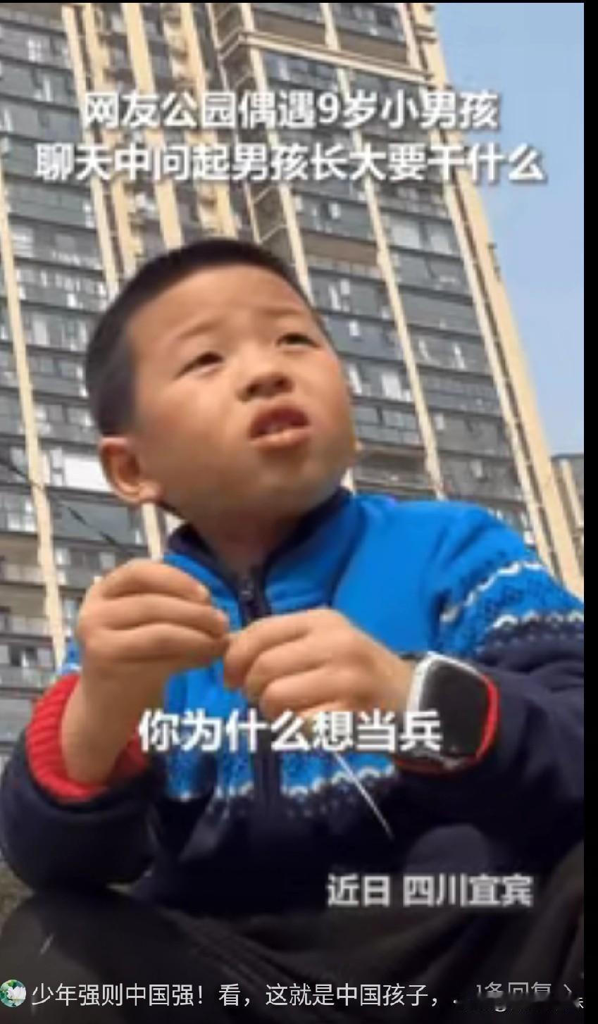 火到人民日报了!”四川,一男子在公园散步时偶遇一9岁男孩,聊天中问起长大想干什么时。结果,两人的对话火遍全网!人民日报配文“为中华崛起而读书!” 这句稚嫩又铿锵的回答,没有丝毫刻意的表演,却像一道暖流直击人心,这是刻在新时代少年骨子里的家国情怀,简单纯粹却有着撼动人心的力量。 男孩面对提问时眼神清亮、语气坚定,直言长大想当兵守护祖国边疆,守护身边的家人和同胞,被问及当下该做什么,他脱口而出要为中华崛起而读书。 人民日报特意为这个9岁孩子发声点赞,短短一句配文分量十足,这是对少年初心的最高认可,也为无数青少年树立了最鲜活的学习榜样。 百年前,少年周恩来立下为中华崛起而读书的宏愿,带领先辈们披荆斩棘换来了山河无恙,百年后,四川孩童用童声接力,让这份初心代代相传。 中国青年报社最新调研显示,98.0%的受访少年儿童心怀报国志向,95.4%的孩子渴望成长为国家栋梁,爱国的种子早已在青少年心中生根发芽。 孩子的赤诚志向从来不是凭空而来,离不开家庭的言传身教,离不开学校的红色教育,更离不开强大祖国给予少年儿童的底气与自豪。 这段对话的视频全网播放量突破上亿次,数百万网友留言看哭,大家感动的不只是孩子的纯真,更是民族精神生生不息的鲜活见证。 少年强则国强,少年有志则国振兴,9岁的孩子不懂深奥的大道理,却清晰懂得读书的意义,明白成长就是为了守护脚下的这片土地。 当下全国未成年人图书阅读率已升至86.2%,人均阅读量持续增长,书香校园与家国教育,让越来越多孩子找准了人生的方向与目标。 当兵守疆土是远大理想,读书报国家是当下行动,孩子把梦想和实干紧紧结合,不空想、不浮躁,这份脚踏实地的态度更让人动容。 从逐梦航天的青年团队,到驻守边疆的年轻战士,再到这个四川男孩,一代代中国人都在用行动践行着不变的家国信仰。 爱国从来不是喊在嘴上的空洞口号,它藏在孩子坚定的回答里,藏在每日伏案苦读的坚持里,藏在甘愿为祖国奉献的赤子心中。 这样有志向、有担当、有情怀的少年,是家庭的骄傲,更是民族的希望,他们眼里有光、心中有爱,注定成为祖国未来的坚实脊梁。 很多家长总为孩子的成长焦虑,纠结于成绩和才艺,却忘了教会孩子爱国、感恩、立大志,才是人生最珍贵的教育。 我们不必羡慕别人家的孩子,这个9岁男孩的故事告诉我们,最好的成长,就是心怀家国、脚踏实地、向阳而生。 一句誓言跨越百年时光,一颗初心温暖亿万国人,这就是中国少年该有的模样,这就是中华民族永远向前的力量源泉。 平凡的公园偶遇,简单的几句对话,却折射出新时代青少年的精神风貌,也让我们看到祖国未来最可期的模样。 家国情怀无需华丽辞藻修饰,少年志向无需刻意雕琢,这份发自内心的赤诚,就是最动人的中国力量。 各位读者你们怎么看?欢迎在评论区讨论。