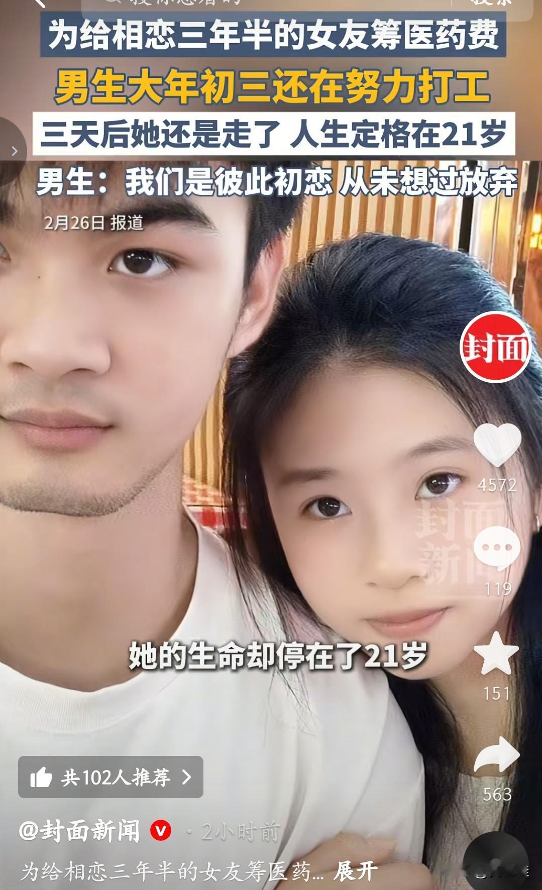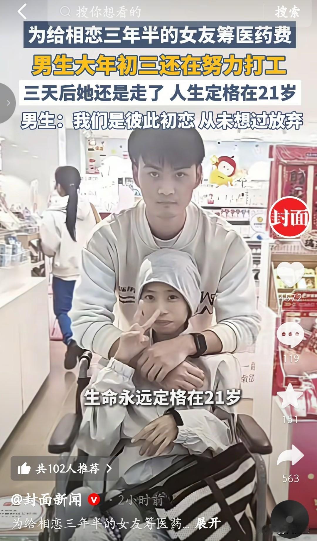 大年初三,别人在走亲访友,他却在工位上争分夺秒。相恋三年半的初恋,确诊癌症晚期后,他陪着往返京沪求医,过年也不敢停下——多赚一分,就多一分希望。三天后,那个21岁的女孩还是走了。他说:“从确诊那天起,我们从未想过放弃。”可命运的残酷,终究让这份坚守,变成了永远的遗憾。 这个故事真的好悲伤,她会是他永远的白月光!有情有义的好男人,他要怎么走出来?