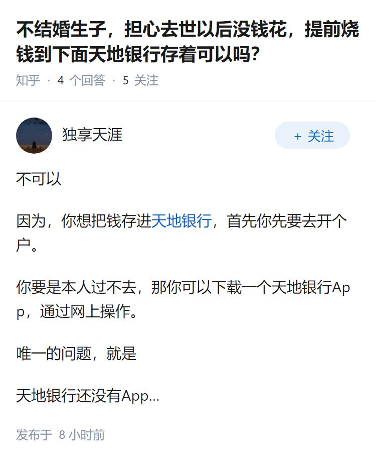 不结婚生子,担心去世以后没钱花,提前烧钱到下面天地银行存着可以吗?