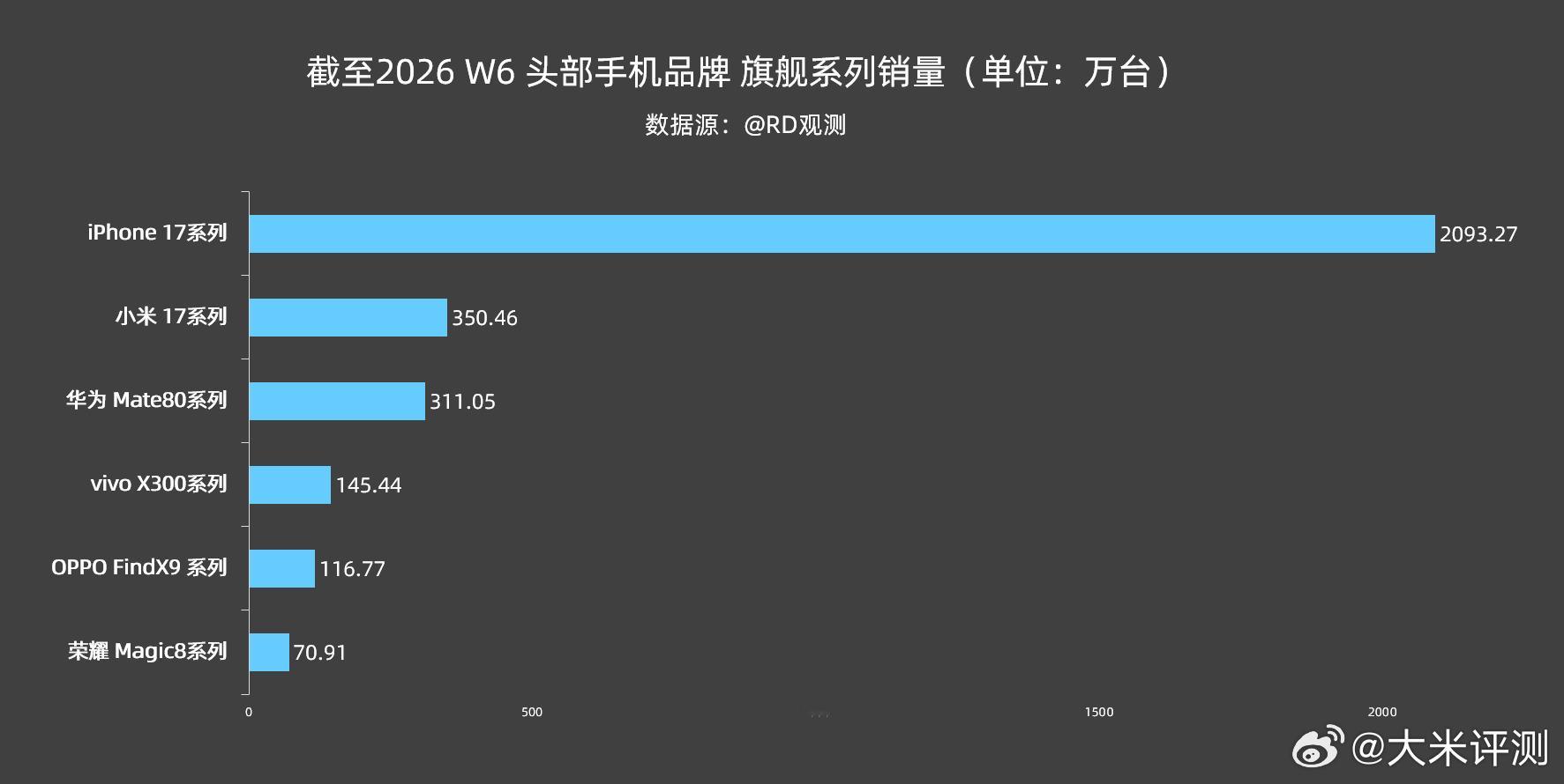 截至2026 W6 头部品牌旗舰系列销量情况:果子17系列:2093.27W;小米17系列:350.46W;华为Mate80系列:311.05W;vivo X300系列:145.44W;OPPO FindX9系列:116.77W;荣耀Magic8系列:70.91W;