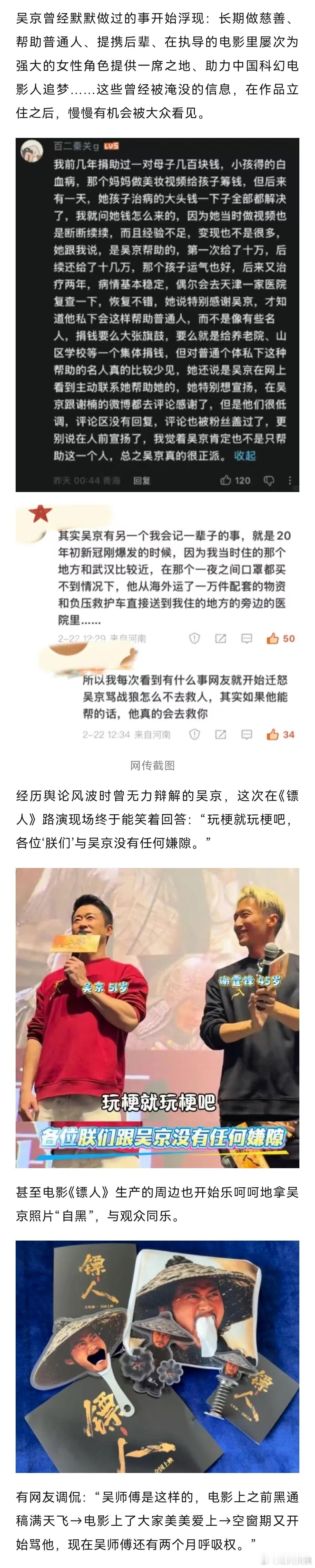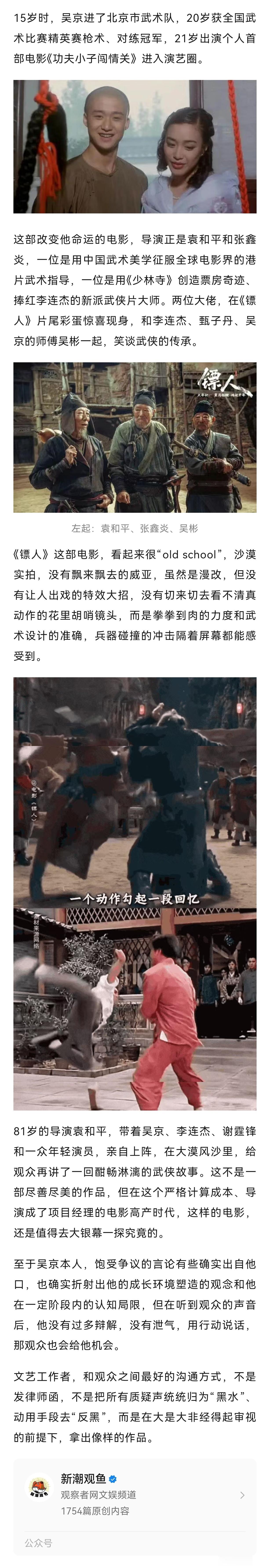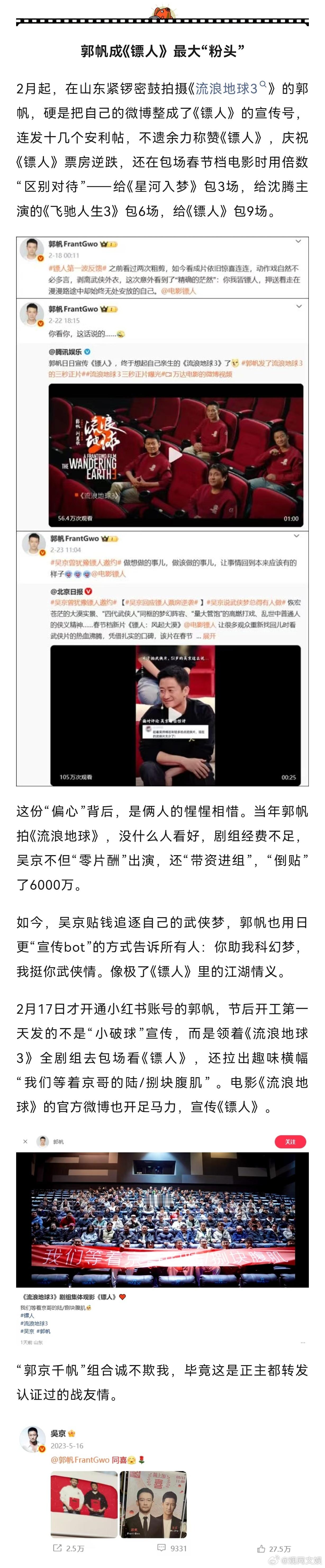 然而,随着吴京监制和主演的电影《镖人》在这个春节上映,他倾情全力支持伯乐袁和平筹备十年的作品的行动力,坚持实景拍摄不敷衍观众的决心,让人看到了他对本职工作认真刻苦的态度,迎来了一波“护镖”网友的自来水好评。《流浪地球》系列导演郭帆的“全自动安利”,也让人们看到了吴京的行业口碑。
