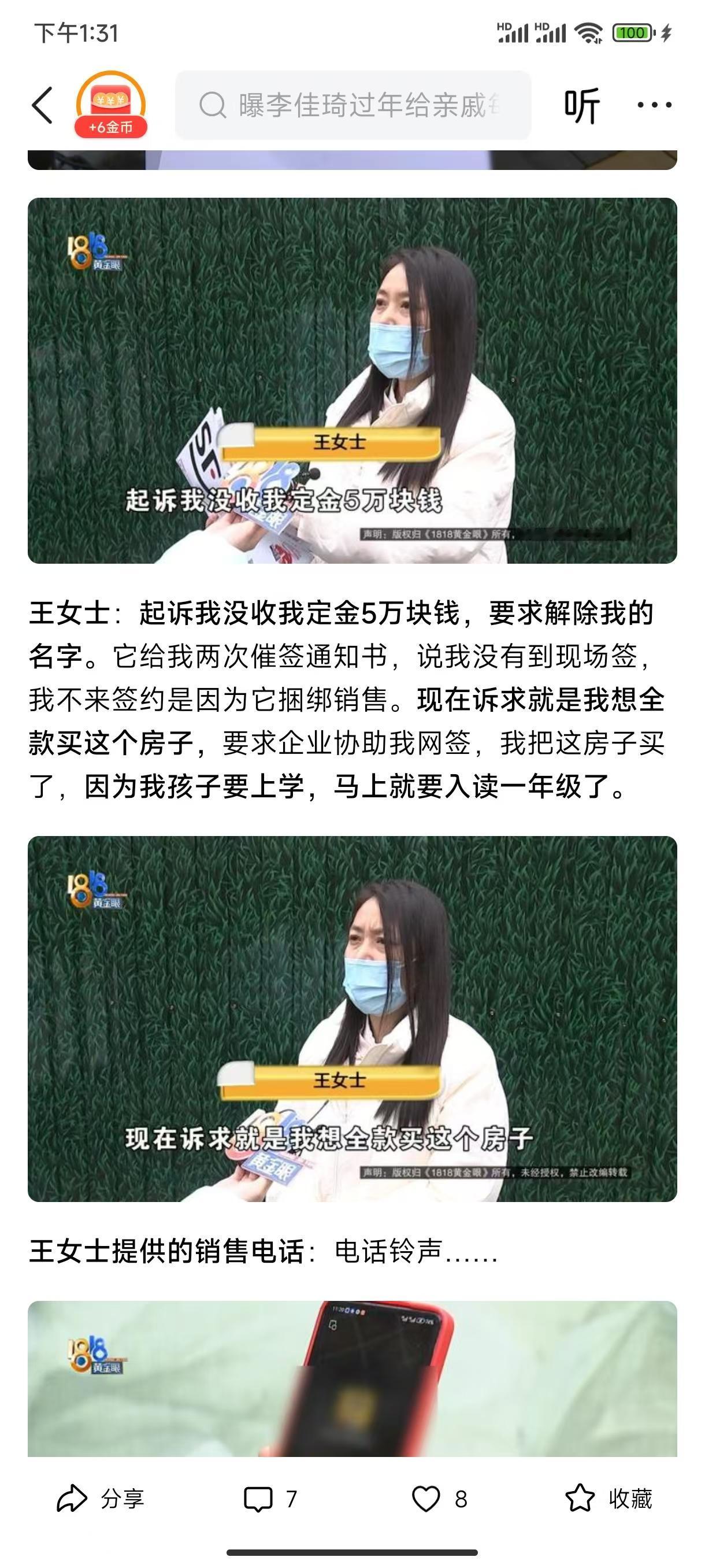 沙发40万,冰箱20万,不买车位回家都不能实现! 山东的王女士在杭州拱墅区买别墅被强制消费买高价沙发、冰箱,车位,地下室,不买被销售处处为难,还扬言不买从地面回家都不能现实,贷款也批不下来,而且还被开发商起诉要没收5万定金! 这是开发商与银行勾结吧,而且还言听计从。现在房子都卖不出去,杭州拱墅区还这样嚣张房地产没人管了吗? 定金就是筹码。交定金之前,要慎之又慎。购房者要事先把购房细节和潜在的风险都考虑进去,并将风险规避的诸多事项约定在购房协议和合同里,白纸黑字。筹码一旦轻易交出去,就是任人宰割的开始!