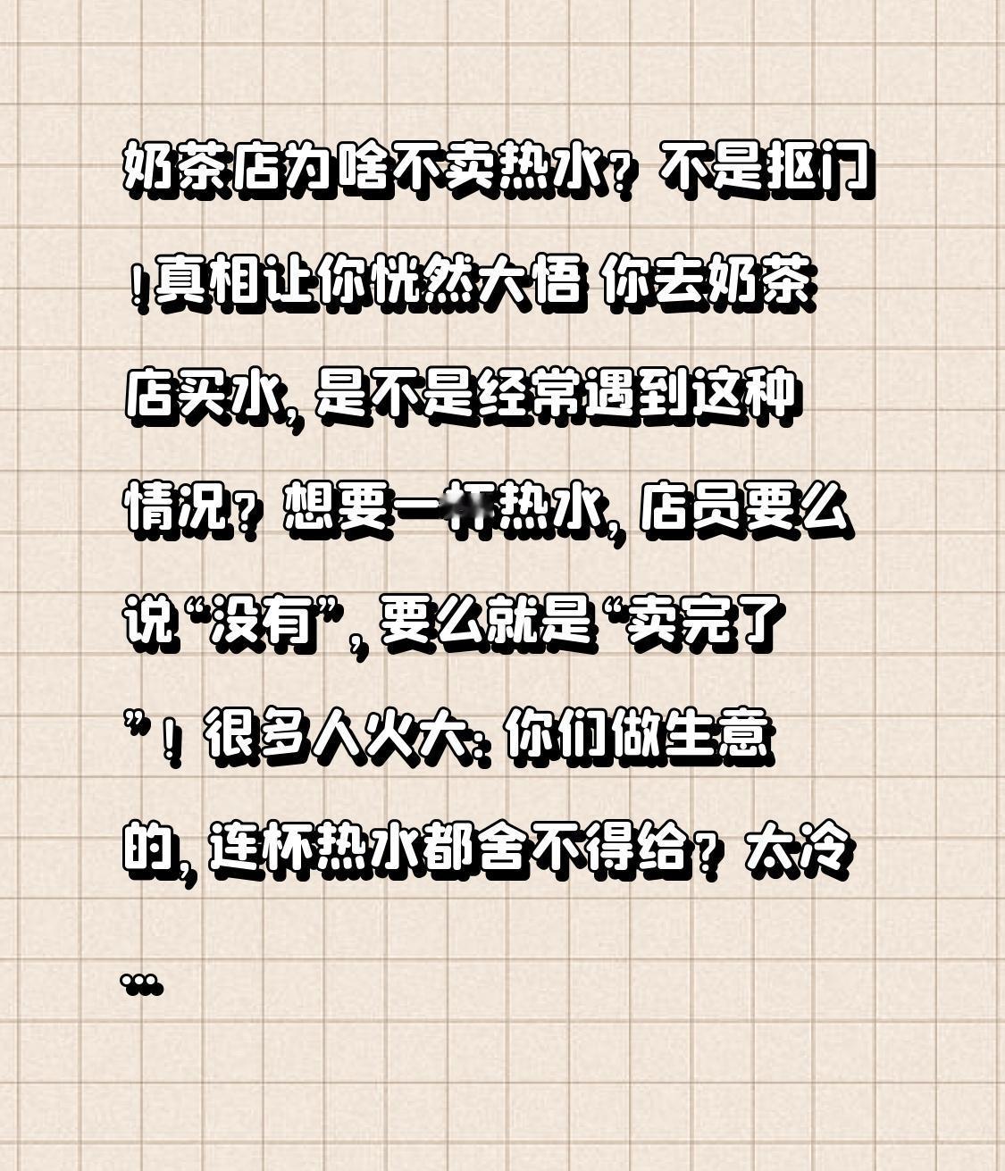 奶茶店为啥不卖热水?不是抠门!真相让你恍然大悟 你去奶茶店买水,是不是经常遇到这种情况?想要一杯热水,店员要么说“没有”,要么就是“卖完了”! 很多人火大:你们做生意的,连杯热水都舍不得给?太冷漠了!甚至有人吐槽,赚着我的钱,连点基本福利都不给,真是越想越气! 我以前也觉得,这就是店家小气,怕免费喝水耽误我买奶茶。直到后来,我才知道,这里面藏着的全是行业内幕,真不是你想的那样! 首先,最大的原因就是卫生与合规。正规奶茶店的饮用水,必须经过严格的净化、煮沸、冷却等一系列流程,而且要全程在密闭的设备里。 你要是点一杯热水,店员现烧?那时间太慢了,根本赶不上出餐速度,顾客等急了给差评!要是用保温桶长期存热水?时间久了不符合食品安全标准,还容易滋生细菌,被查到就是重罚。所以,与其冒着违规风险给你倒杯热水,不如直接说没有,这是对双方都负责。 其次,奶茶店的设备逻辑,就是做“冷饮”的。大多数奶茶店的核心设备是制冰机、冷藏柜和各种调配机,热水机并不是标配。店里只有一台大的开水器,主要是给员工清洗、消毒用的,预留的饮用热水非常有限。 你要一杯热水,员工可能真的是“有心无力”,而不是“不想给”。 还有一个更现实的原因:成本与动线。一杯热水看似简单,但占用了操作台空间,万一洒出来还会造成安全事故,影响后面几十杯奶茶的制作。店员忙着做单,再分心去倒热水,很容易搞乱流程。 不过也有好消息!绝大多数奶茶店,其实对特殊人群是“通融”的。 如果你是老人、小孩,或者确实身体不舒服需要热水,真诚跟店员说一声,大部分人都会帮忙。毕竟,谁都有需要搭把手的时候。 所以下次去奶茶店,别再因为没热水生气了。不是人家冷漠,而是这背后有太多难言之隐。 互相理解一下,咱们买水的时候多一点耐心,店家做生意也多一份轻松。 你遇到过奶茶店不卖热水的情况吗?评论区聊聊你的经历!
