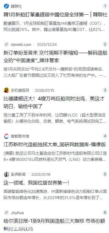 40艘大单直接砸向中国,韩国造船业拿到了全球62%的订单,韩媒马上狂欢,还扬言“重夺第一”,结果得意劲儿还没捂热,就被泼了盆冷水。 麻烦看官老爷们右上角点击一下“关注”,既方便您进行讨论和分享,又能给您带来不一样的参与感,感谢您的支持! 2025年年初,全球造船业的目光都被韩国吸引过去了。就在2月初,韩国媒体像过节一样热闹,纷纷甩出一份亮眼的成绩单:根据英国克拉克森研究公司发布的数据,今年1月份,韩国造船业承接的全球订单占比高达62%,直接把中国甩在了身后,时隔几个月重新夺回了“世界第一”的宝座 。韩媒的标题一个比一个激动,“重夺第一”、“吹响反击号角”这样的字眼随处可见,仿佛那个曾经被中国压着打的阴影终于要散去了 。 也不怪他们这么兴奋。毕竟在过去几年,中国造船业就像是开了挂,从2021年到2024年,连续四年把全球接单冠军的奖杯抱在怀里,而且优势越滚越大。尤其是2024年,中国船企拿走了全球70%的订单,把韩国的市场份额压缩到了17%,这可是2016年以来韩国从未有过的惨淡业绩 。所以当2025年第一个月的捷报传来,韩国业界那股扬眉吐气的劲儿,隔着黄海都能感受到。 但这种狂欢仅仅持续了不到一周,就有冷静下来的人发现了不对劲。仔细看看克拉克森那组原始数据,虽然按照修正总吨来计算,韩国确实是62%,中国只有19%,可要是比订单的绝对数量,中国拿到了21艘,而韩国只有13艘 。这就很有意思了,数量少反而占比高,主要是因为韩国接的那几艘船单价更高,属于高附加值船舶。但这还不是问题的关键,真正给韩国泼冷水的是那个时间节点——1月份,正好踩在了中国春节的门槛上。 咱们中国人过年意味着什么?那是工厂停工、工人返乡、产业链进入休眠期的节奏。对于造船这种需要庞大产业工人协作的行业,春节前后的这一个月,本来就是传统的接单和交付淡季。当时中国各大船厂的工人们正准备回家吃团圆饭,生产节奏放缓,谈判和签约自然也就往后推了。而韩国不过春节,趁着这个空档期发力,拿下几单大生意,确实在单月数据上占了上风。这就好比一场马拉松,韩国在第一个补给站猛冲了一下抢到了领跑的位置,但抬头一看,中国选手的手里还攥着大把的余力没使出来呢。 果然,等春节的鞭炮声一停,中国造船业的状态立刻就不一样了。到了2025年底,当媒体走进中国船舶集团旗下的上海三大船厂时,看到的是一片热火朝天的赶工景象。外高桥造船、江南造船、沪东中华这三家,手里攥着的订单已经排到了2028年,年初那一个月,它们平均每2.8天就要交付一艘新船 。更让对手感到压力的,不仅仅是快,而是那种可怕的标准化和批量化能力。 就拿大连的恒力重工来说,2026年刚开年,这家船厂就干了一件让全球航运界瞪大眼睛的事。在一个船坞里,四艘平均吨位超过30万吨的超大型原油运输船(VLCC)同时出坞,总吨位直接迈过百万吨的门槛。这四艘巨轮从开工到出坞,只用了180天 。180天是什么概念?放在以前,造一艘这种体量的巨轮,没个200多天下不来,而且很少有船厂敢同时铺开四艘。恒力重工做到了,靠的是把汽车制造厂的“流水线”思维搬进了造船厂,也就是所谓的“节拍化造船”。所有的工序都被拆解成精准的时间节点,上一道工序刚完,下一道立马接上,根本不给“等料、等人、等设备”留一点空隙。钢材的利用率被提到了92%,成本自然就压下来了。有行业内的数据透露,靠着这种全产业链的协同和高效的节拍化管理,现在中国造一艘超大型原油运输船的单船成本,要比韩国同行低出大约10.4% 。造船这事儿,拼到最后其实就是拼成本、拼效率,谁能在保证质量的前提下造得又快又便宜,船东的钱就往谁的口袋里跑。 说到质量和技术,这就不得不提另一个让韩国人后背发凉的领域——LNG船。以前这可是韩国造船业的“禁脔”,是它们牢牢攥在手心里的王牌。早些年,全世界的LNG船订单,绝大部分都流向了韩国的三大船厂,因为这东西技术门槛太高,要把零163度的液化天然气安全地运过大洋,那一套围护系统的焊接和安装,没有几十年的积累根本玩不转。但这两年,局势悄悄变了。2025年,全球航运巨头马士基做了一个让业内震动的决定,把一笔8+4艘以LNG为动力的双燃料集装箱船大单,交给了江苏新时代造船 。虽然这批船是集装箱船,但动力系统用的是LNG燃料,这意味着中国船厂在LNG应用和配套技术上已经彻底打通了任督二脉。加上之前沪东中华在LNG运输船上的批量建造,中国在这个曾被韩国垄断的高端细分市场,已经撕开了一道大口子。