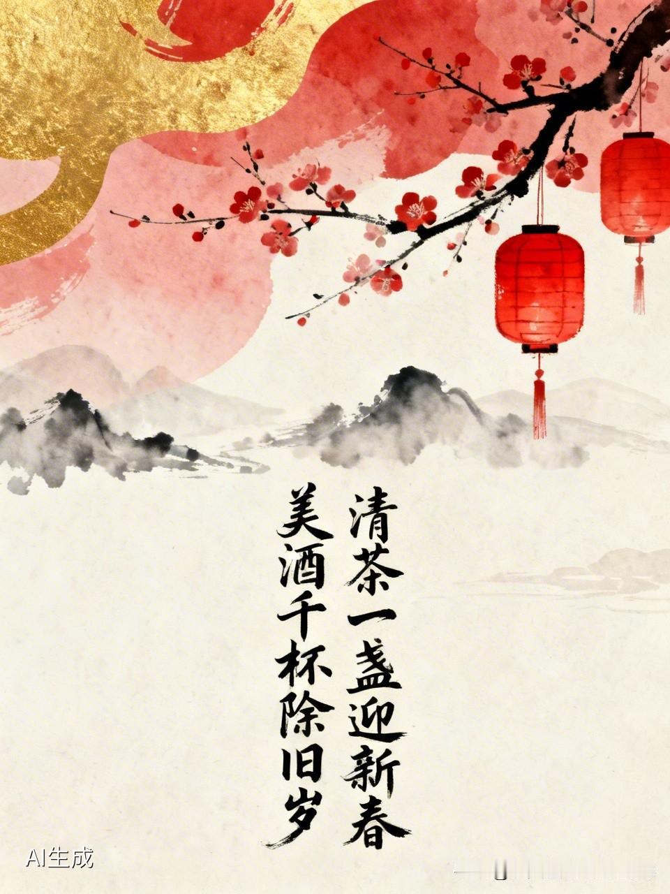 上联:美酒千杯除旧岁 下联:清茶一盏迎新春
