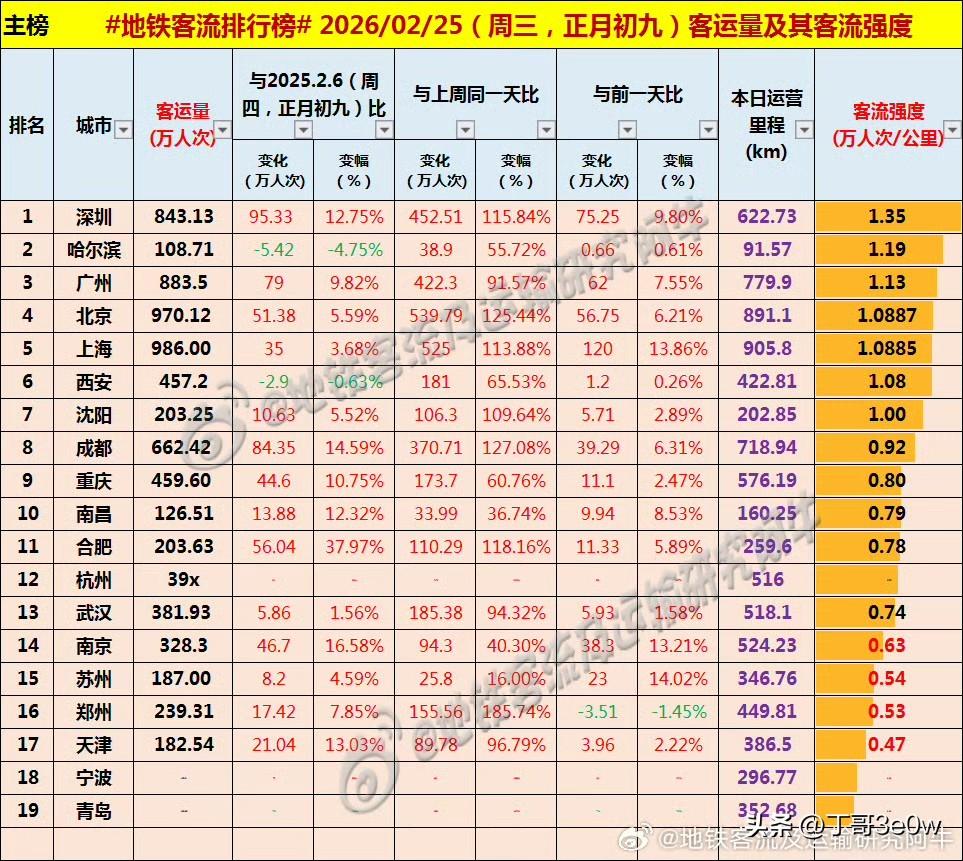 初九深圳地铁客流量恢复到800万人次以上,为843万多[呲牙][呲牙][呲牙] 爆料 身边事 中国地铁客流日报 昨日客流 排行榜 初九 周三 2026年2月25日 星期③ 全国重点城市轨道交通客流量排行榜: 上海:986.00万 北京:970.12万 广州:883.50万广州地铁 深圳:843.13万 成都:662.42万 重庆:459.60万重庆地铁 西安:457.20万西安身边事 杭州:390万+杭州地铁 武汉:381.93万 南京:328.30万南京爆料 郑州:239.31万郑州身边事 合肥:203.63万合肥地铁 沈阳:203.25万沈阳身边事 苏州:187.00万 天津:182.54万天津爆料 青岛:126万+青岛地铁 南昌:126.51万 宁波:108万+宁波爆料 哈尔滨108.71万