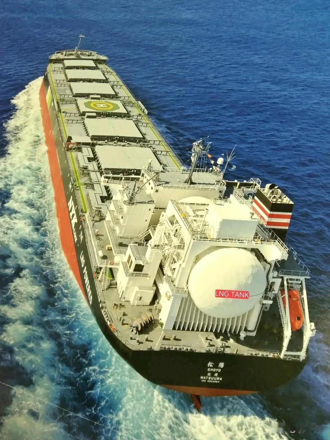 这艘船是“松阳号”(Shoyo),它是世界上第一艘以液化天然气(LNG)为燃料的巴拿马型煤炭运载船。 该船由日本邮船株式会社(NYK)和九州电力公司共同运营,并由大岛造船所建造。以下是关于这艘船的一些详细信息: 核心参数与技术特点 清洁能源: 船尾显眼的球形结构是 LNG 燃料舱。使用 LNG 作为燃料可以比传统重油燃料减少约 30% 的二氧化碳(CO2)排放,减少 80% 的氮氧化物(NOx)排放,且几乎不排放硫氧化物(SOx)。 船舶规格: 类型: 巴拿马型(Panamax-class)散货船,专门用于运输煤炭。 尺寸: 全长约 235 米,型宽 38 米。 载重: 载重吨位约为 95,233 吨(另有提及 70,000 至 99,999 DWT 范围)。 设计亮点: 船身侧面印有醒目的“NYK LINE”和“LNG POWERED”字样,并配有用于运输和紧急操作的直升机停机坪。 运营背景 “松阳号”于 2023 年 10 月正式投入运营,主要负责为九州电力的燃煤发电站运载海外进口煤炭。其名称“松阳”寓意“照耀”,也与相关的 LNG 运输船命名风格相呼应。