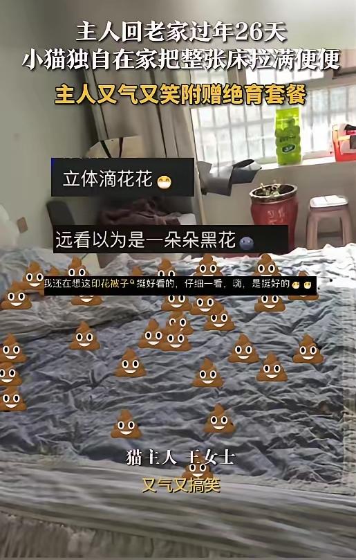 爱猫人士真是个谜, 看到一床单猫💩竟让能哭笑不得, 要知道猫尿的气味非常大,很难闻,不敢想象,这一床那么多,味道得多冲。 换成别的人床都不想要了。 而且你们发现了吗,这个猫主人整整离家26天,让一个小猫单独待在房子里,这也不算是爱护宠物吧。
