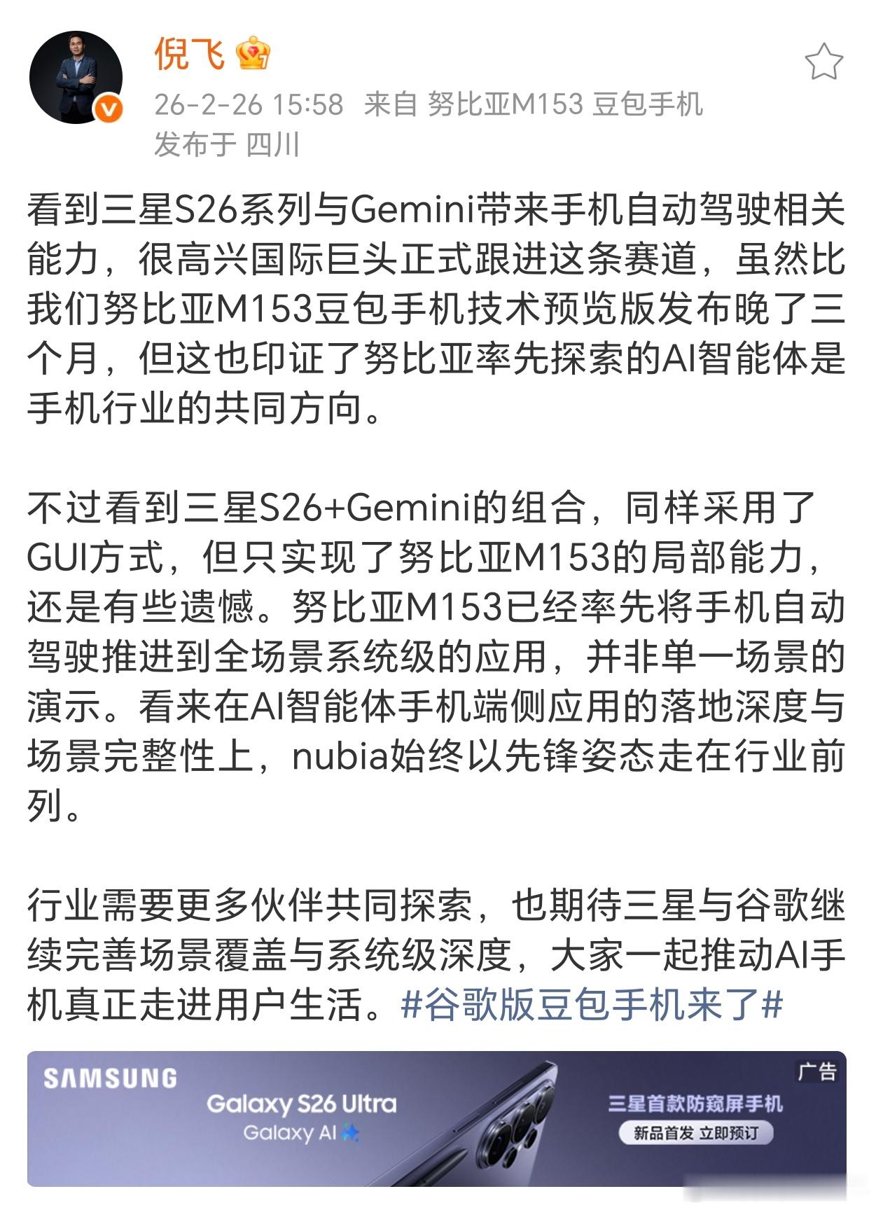 去年努比亚与字节跳动合作的豆包手机火遍了全网,一度到了一机难求的局面,看得出来真AI手机的吸引力是足够强的,国际巨头们也开始跟进了,但是整体的自动化能力还是豆包更领先一些,今年AI手机的概念肯定会被所有手机厂商重点提及,期待一下努比亚总裁倪飞回应谷歌版豆包手机倪飞称豆包手机领先三星谷歌组合