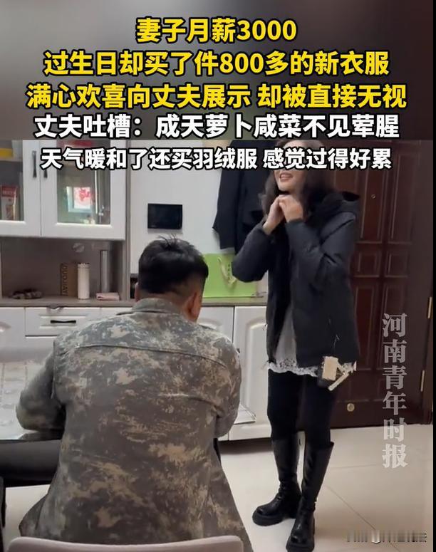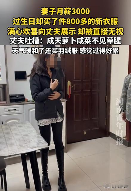 陕西,一女子月薪3000元,过生日这一天,丈夫没有准备礼物,女子花800元给自己买了一件羽绒服作为生日礼物。女子开心的穿上新衣服,在丈夫面前展示,并询问丈夫好不好看。谁知道,丈夫直接甩脸,表示:天都暖和了,还要买这么贵的羽绒服干什么?随后,就自顾自回房间了,留下一脸尴尬的妻子。 正所谓贫贱夫妻百事哀,虽然妻子的收入不高,但是过生日这个重要的日子,作为老公就应该出钱买礼物,妻子自己买衣服,他还不情不愿。(正见新闻2月25日报道了该案例。) 首先,可以询问一下大家,如果您的老婆没有工作,没有收入,你们会主动拿钱给老婆花,或者是否会主动赠送礼物呢? 像这位女子,自己还有工作呢,自己花钱买个生日礼物,没想到,就被丈夫一顿吐槽。 来自陕西的张女士,在当地过着清闲的生活,有一份简单的工作,月收入是3000元。丈夫也是差不多的境况,二人过着平淡的生活。 张女士自知收入也不是很高,所以平时生活非常节俭。 正如她丈夫吐槽的那句话:“一天到晚的,不是咸菜、就是萝卜干,不见一点荤腥的。” 由这句话可见,谁家过生活不是居家过日子的呢,总归要省着点开销呗。 时间一晃就来到了张女士过生日这一天,本来张女士心想,这一年到头的,省吃俭用的,难得过个生日,也给买个礼物嘉赏一下自己了。 于是张女士就外出逛街,挑选了一件800元的羽绒服。 张女士看了非常喜欢,满心欢喜的买回了家。 本来张女士还以为丈夫也会给自己生日的惊喜呢,但是一直等到吃完晚饭,丈夫也没有表示,张女士内心有一些失落。 为了缓和气氛,张女士决定给丈夫展示一下自己的新衣服。 她穿上了新买的羽绒服,然后询问丈夫:“你看看,好看吗?” 本来想要得到丈夫的肯定,谁知道,丈夫不冷不淡的问了一句:“多少钱啊?” 张女士则表示,花费了800元买回来的。 没想到,坐在餐桌旁的丈夫,直接就拉下了脸,不断给张女士甩脸色。甚至还蹦出几个字:“天气都往暖处过了,还买个羽绒服。” 随后,丈夫就不再讲话,直接回了房。 就这样,张女士直接就被晾在了客厅,她的表情凝固了,这一刻,她的内心似乎在思索:婚姻的意义,究竟是什么? 而一旁的桌子上,还残留着吃剩下的饭菜,张女士需要一个一个的收拾干净、一遍一遍的冲洗饭碗。 这就是结婚的意义? 上班、赚钱;做家务、给他做饭;过生日没礼物,花自己钱买衣服还要被吐槽。这就是一个妻子应该面对的生活吗? 就算800元的羽绒服很贵,但是一年才买一次,而且还是生日礼物,这就有错吗? 因为一年一次的犒劳自己,就要面临丈夫的冷暴力,张女士真的是感到心寒。 本案释法: 男子面对老婆的生日,也不买生日礼物,还怪妻子购买了衣服贵,之后开始冷嘲热讽、甚至甩脸、冷暴力对待妻子。如何评价这位丈夫的做法呢? 根据《反家庭暴力法》第二条规定,家庭暴力是指家庭成员之间,以殴打、伤害、限制人身自由、谩骂、恐吓、精神伤害等方式做出的侵害行为。 虽然“冷暴力”并没有直接放入这条法令里,但是已经将这种方式纳入了“精神侵害”的范畴。 这位丈夫的行为,本质上是在以一种经济指责作为手段,以冷暴力作为表现形式的情感操控,不仅会伤害夫妻之间的感情,甚至已经构成了法律意义上的家庭暴力。 对于丈夫的做法,他并不是说“忘记买礼物”,而是在制造“情感债务”,在隐形控制妻子的逻辑。 他的意思就是:你花了钱,你不对,你需要反思,我也可以不理你,我甚至可以冷暴力你! 这就是一种典型的情感勒索,冷嘲热讽对待妻子,甩脸、冷暴力,说起来是3000的月薪竟然买800的衣服,就会把正常的消费行为扭曲成为一种过错。 之后,就让妻子陷入自责中,长期下去,妻子甚至还会焦虑、抑郁、甚至自我怀疑。 生活再怎么难,作为男人,你要肩负起主要的经济责任,妻子正常的买个衣服,也没有到犯法的地步,不必这么苛责。 对于此案,您怎么看呢?