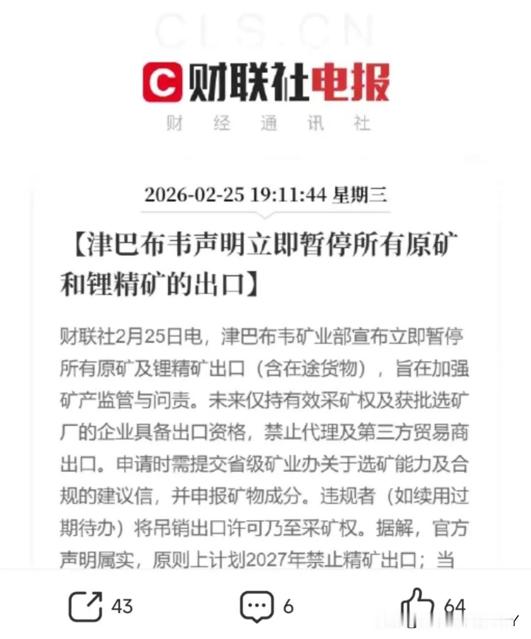 继巴拿马后津巴布韦也对中企手起刀落,我们的海外利益如何保护? 据彭博社消息,盛新锂能、华友钴业、中矿资源等中企已在当地投入数十亿美元,相关企业或将面临重大经营挑战。 中企把矿山建得有模有样,路也修通了,就等着出矿赚钱。结果人家一纸禁令下来,货运不出去,几十亿的投入像打了水漂。这滋味,怕是比哑巴吃黄连还苦。 想想看,这就像你掏空家底装修了套豪宅,家具家电都配齐了,房东突然换了门锁,还说房子归他了。哪有这样的道理?明摆着就是抢。津巴布韦说要搞本土精炼,能增加就业。 这话听着冠冕堂皇,可看看实际情况——电力供应时断时续,技术人员没几个,像样的厂房都找不着,拿什么搞精炼?怕不是打着幌子,想把现成的产业攥在自己手里。 这两步棋,分明是冲着咱们的新能源产业链来的。美国刚开过“矿产安全会议”,转头非洲就有动作,哪有这么巧的巧合? 新能源产业的命门在资源,咱们企业辛辛苦苦在海外布局,就是想把供应链攥稳。现在倒好,人家直接在资源端动手,这算盘打得,隔着太平洋都能听见响声。 这套路,活脱脱就是“杀猪盘”。先给你画个大饼,说这里政策好、机会多,把你的钱骗进来。等你投得深了,抽身难了,再关门打狗,连本带利都想吞。 几十亿美元啊,就这么可能打了水漂,这学费交得也太疼了。中企出海不容易,背井离乡去陌生的地方开矿、建港口,图的是共赢。 可架不住有人不讲规矩,今天签好的合同,明天就能撕了;昨天说好的政策,今天就能变卦。巴拿马强接港口是如此,津巴布韦停锂矿出口也是如此。他们眼里哪有什么商业信誉,只有赤裸裸的利益。 有人说,做生意有风险,海外投资更甚。这话没错,可风险也分两种,一种是市场波动、技术迭代,另一种就是这种明抢豪夺。前者能靠本事规避,后者防不胜防。 咱们的企业走出去,不光要带资金、带技术,更得带副“火眼金睛”,看清合作方的底细,摸透当地的水有多深。不然,钱投进去了,力也出了,最后可能落个竹篮打水一场空。 美国在背后鼓捣什么,明眼人都清楚。新能源是未来的赛道,谁掌握了矿产资源,谁就有话语权。他们自己本土资源不够,就动歪心思,撺掇别的国家给中企下绊子。 津巴布韦这步棋,怕是跟美国的“矿产安全会议”脱不了干系。毕竟,把中国企业挤出非洲锂矿市场,受益最大的是谁,不言而喻。 这事儿也给所有出海的中企提了个醒:海外投资,不能只看眼前的利益,更要算好长远的风险账。合作前得把丑话说在前面,合同条款要抠得细之又细,万一对方变脸,得有应对的招。 别轻信什么“友好合作”的口号,关键时刻,能保护自己的只有过硬的合同和周全的预案。巴拿马的港口,津巴布韦的锂矿,这接连发生的事,像两记警钟,敲在所有出海企业的心上。 海外不是温柔乡,处处可能有陷阱。咱们既要大胆走出去,也要小心护好自己。毕竟,钱是辛苦赚来的,不是给别人当“冤大头”的。往后,中企出海的路,怕是会更难走。 但难走也得走,只是每一步都要踩稳了。看清谁是真心合作,谁是笑里藏刀,别再让“几十亿打水漂”的事儿重演。这世道,善良得带点锋芒,不然,真成了别人眼里的“肥肉”,谁都想来咬一口。 消息来源:@财联社