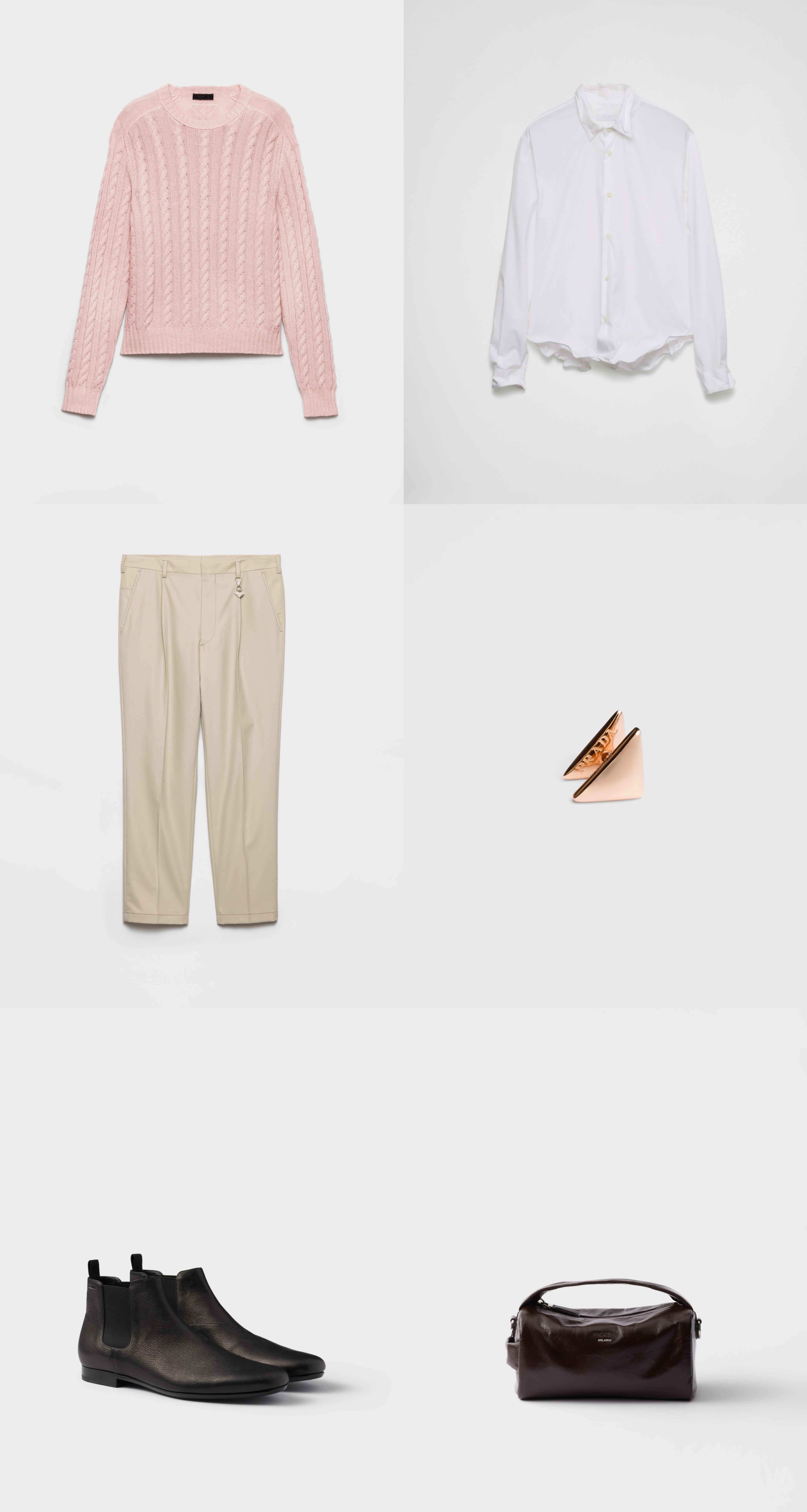 1️⃣ Prada 圆领毛衣2️⃣ Prada 棉质衬衫3️⃣ Prada 棉质长裤4️⃣ Prada 精品珠宝 Eternal Gold系列迷你三角形单耳环5️⃣ Prada 皮革切尔西靴6️⃣ Prada 皮革单肩包