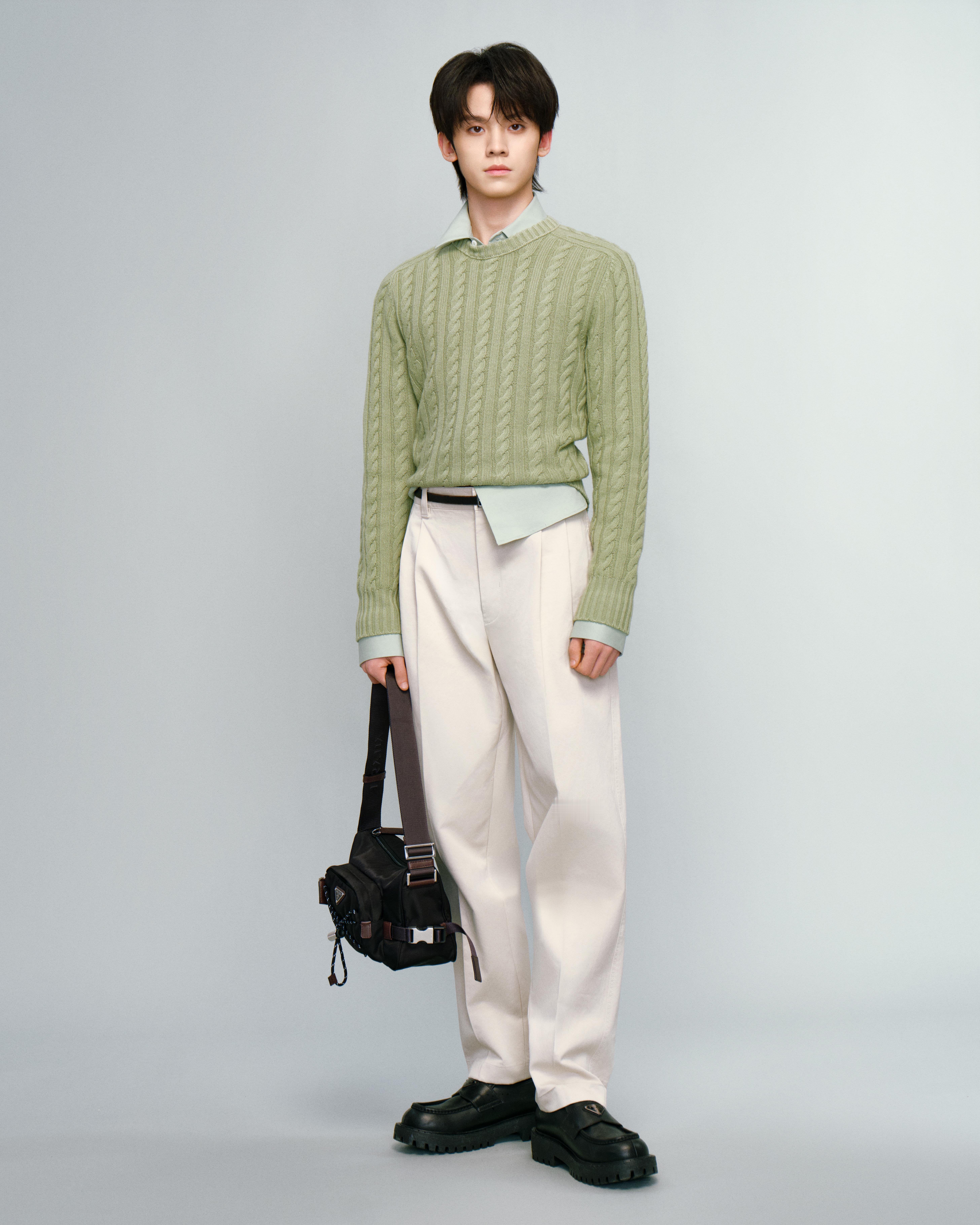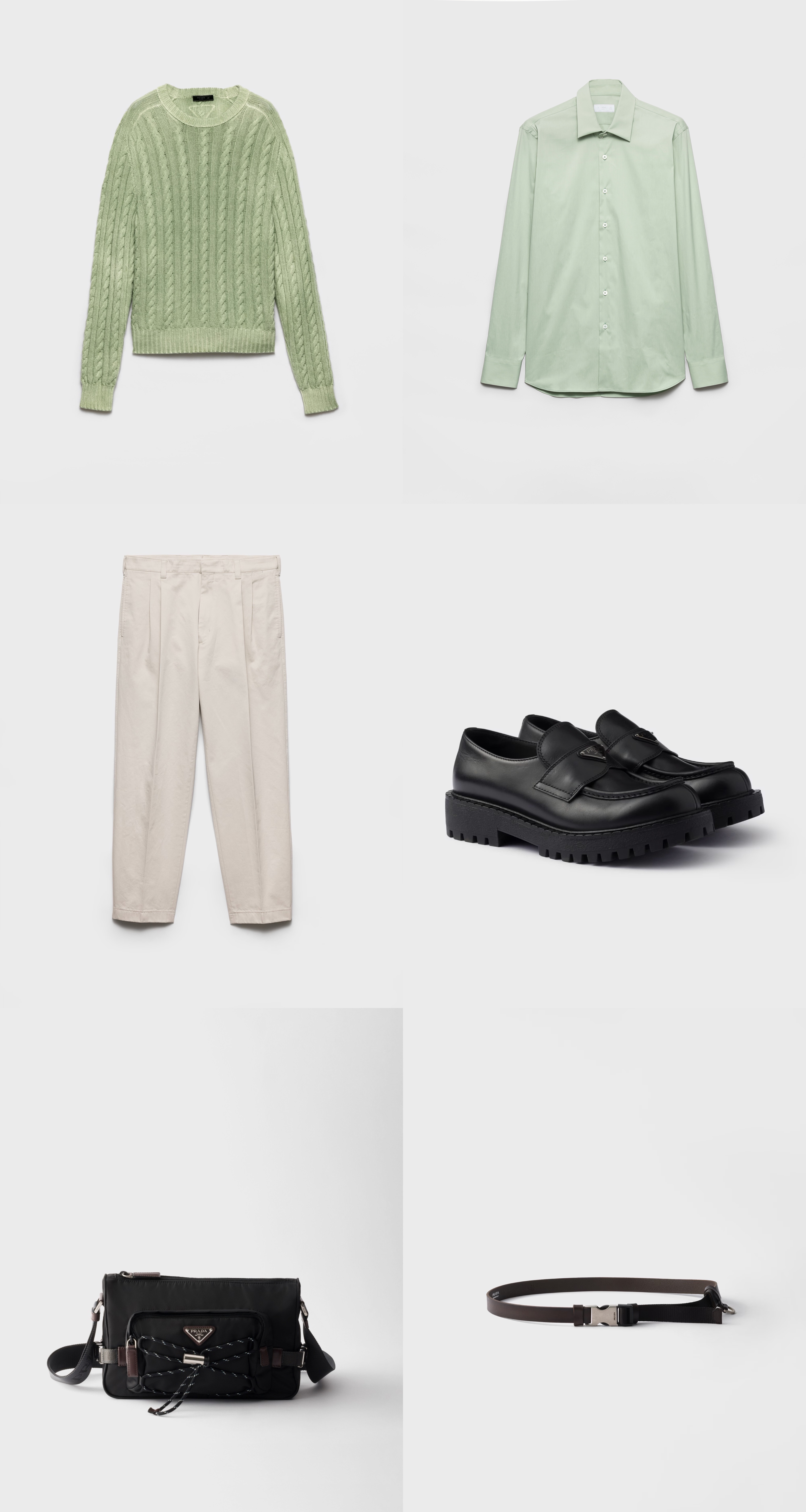 1️⃣ Prada 圆领毛衣2️⃣ Prada 长袖衬衫3️⃣ Prada 棉质长裤4️⃣ Prada 皮革乐福鞋5️⃣ Prada Speedrock Re-Nylon 和皮革单肩包6️⃣ Prada 皮革与编织尼龙织带腰带