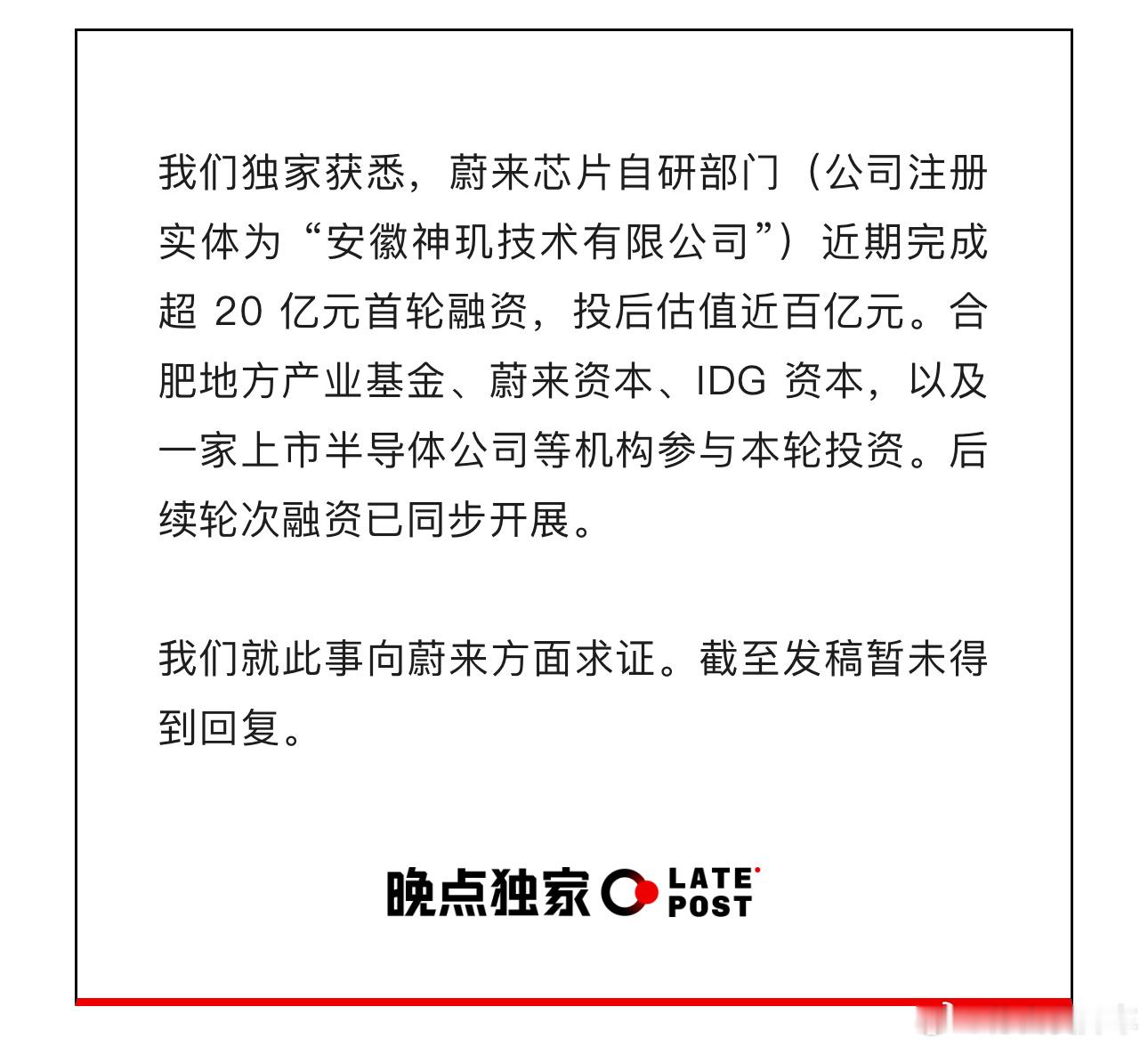 晚点: 合肥国投、IDG 等入股蔚来芯片子公司,首轮投资额超 20 亿元;