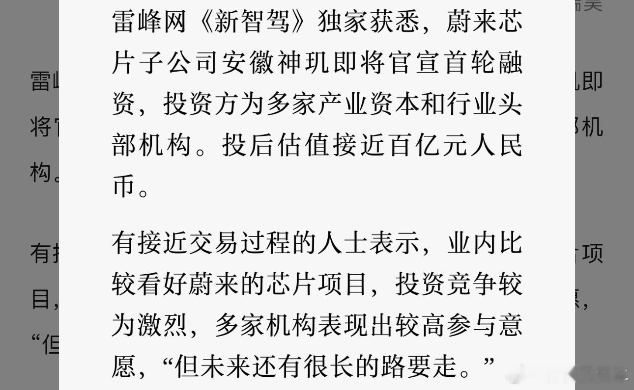 雷峰网新智驾: 蔚来芯片子公司完成首轮融资,投后估值近百亿元;————————蔚来神玑芯片的商业布局逐渐清晰,合肥再次出手,首轮融资超20亿元,