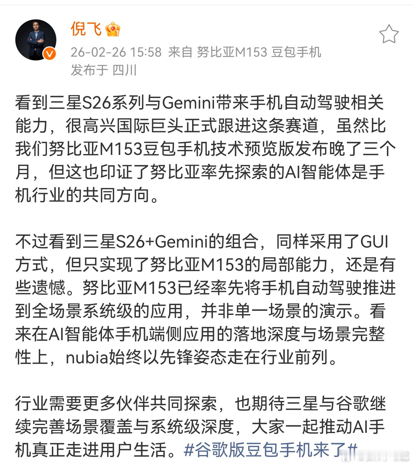 努比亚总裁倪飞回应谷歌版豆包手机想必大家都看到三星S26系列了吧,值得注意的是AI方面的进化,携手Gemini推出手机自动驾驶能力,这也标志三星正式入局AI智能体赛道,而这恰恰印证努比亚M153豆包手机三个月前率先落地的技术路线,作为AI手机先锋,努比亚与豆包联合打造的M153技术预览版,以GUI智能体实现真正意义上的手机全场景自动驾驶,做到系统级、全链路、跨应用的深度落地,而非单点功能演示,反观三星S26+Gemini组合,同样采用GUI方案,却仅实现局部能力,停留在单一场景验证阶段,在系统整合度、场景完整性与端侧落地深度上,与努比亚M153存在明显差距,不得不说,努比亚的的前瞻性还是很强的!倪飞称豆包手机领先三星谷歌组合