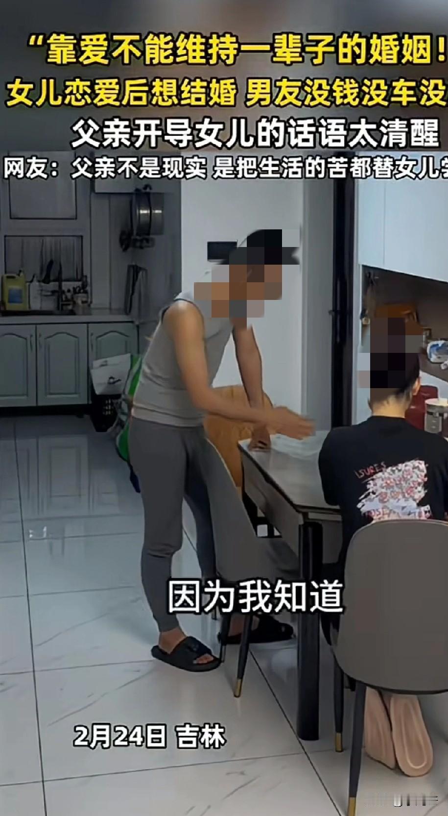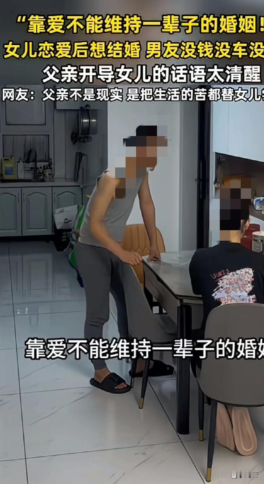 网友发布视频,女儿和男友感情很好要结婚,回来和父母商量。女儿说虽然男友没钱没房没车,但很努力,对她也很好,外在条件不重要。父亲苦口婆心劝说女儿,小伙子没钱没房没车,但是他努力的话以后也可能混的很好,也可能会有大作为。作为女方父亲鼓励男孩子加油,但是我的女儿绝不能嫁给他。 父亲说,不能拿人生中最美好的青春去赌一个未知的未来,未来的事情谁也说不准。 现在是谈恋爱还好,一旦要是结婚成家有了孩子,面对现实的东西太多了,没钱没房没车,一点抵抗社会风雨的底气都没有,你们两个要怎么生活。 作为一个普通家庭的孩子,他不希望女儿以后多大富大贵,多么富裕。就是健健康康、找一个差不多的对象,平淡的度过一生就很好。 女儿听完父亲的话,一直不发声。或许在女儿看来,喜欢很简单,结婚也很简单,把感情婚礼都看的单纯。 而作为父母,总是会想的更多,总想着给孩子遮风挡雨,甚至想帮她扫清人生路上的障碍。 就如同这位父亲所说,他可以鼓励一个年轻人勤奋上进,甚至欣赏男友不怕吃苦的性格。 但他是一位父亲,就要替女儿着想,不敢拿女儿一辈子的幸福去赌,他比谁都明白光靠爱维持不了一辈子。