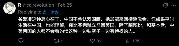 这又是一个对谷爱凌得金牌羡慕嫉妒恨的人,你拿得到金牌吗?拿不到?那你有什么资格指责人家Eileen Gu?你还要说每个人都有发言的权利?那你拿得到金牌吗?拿不到?那你有什么权利?