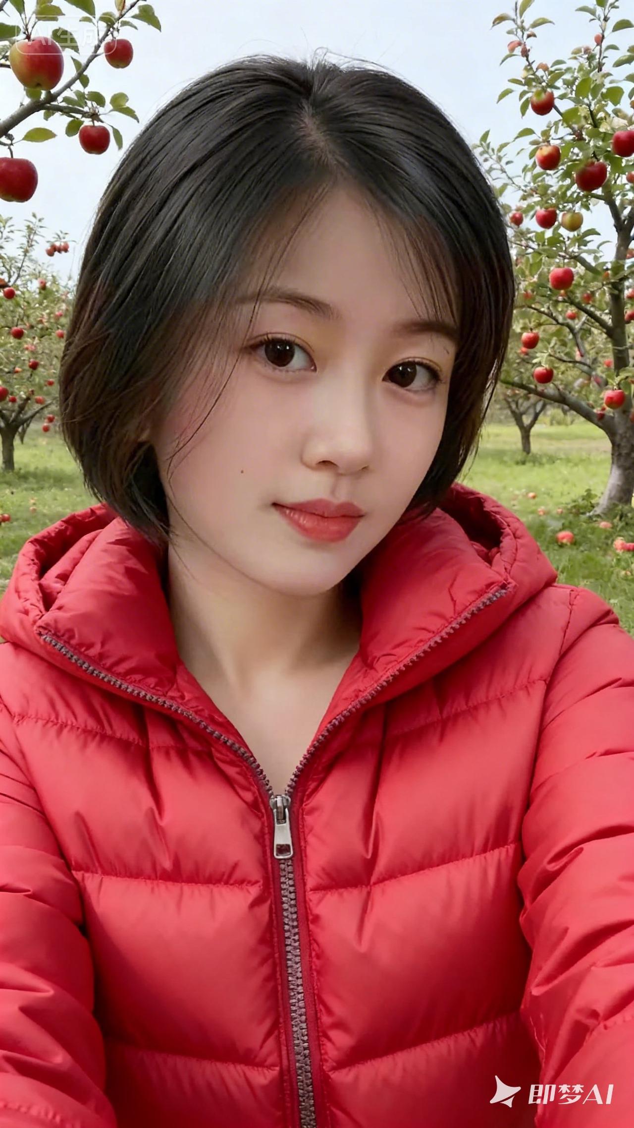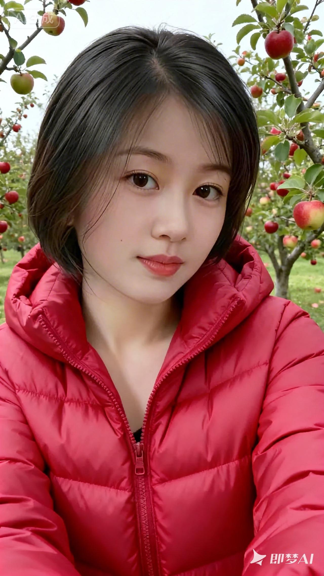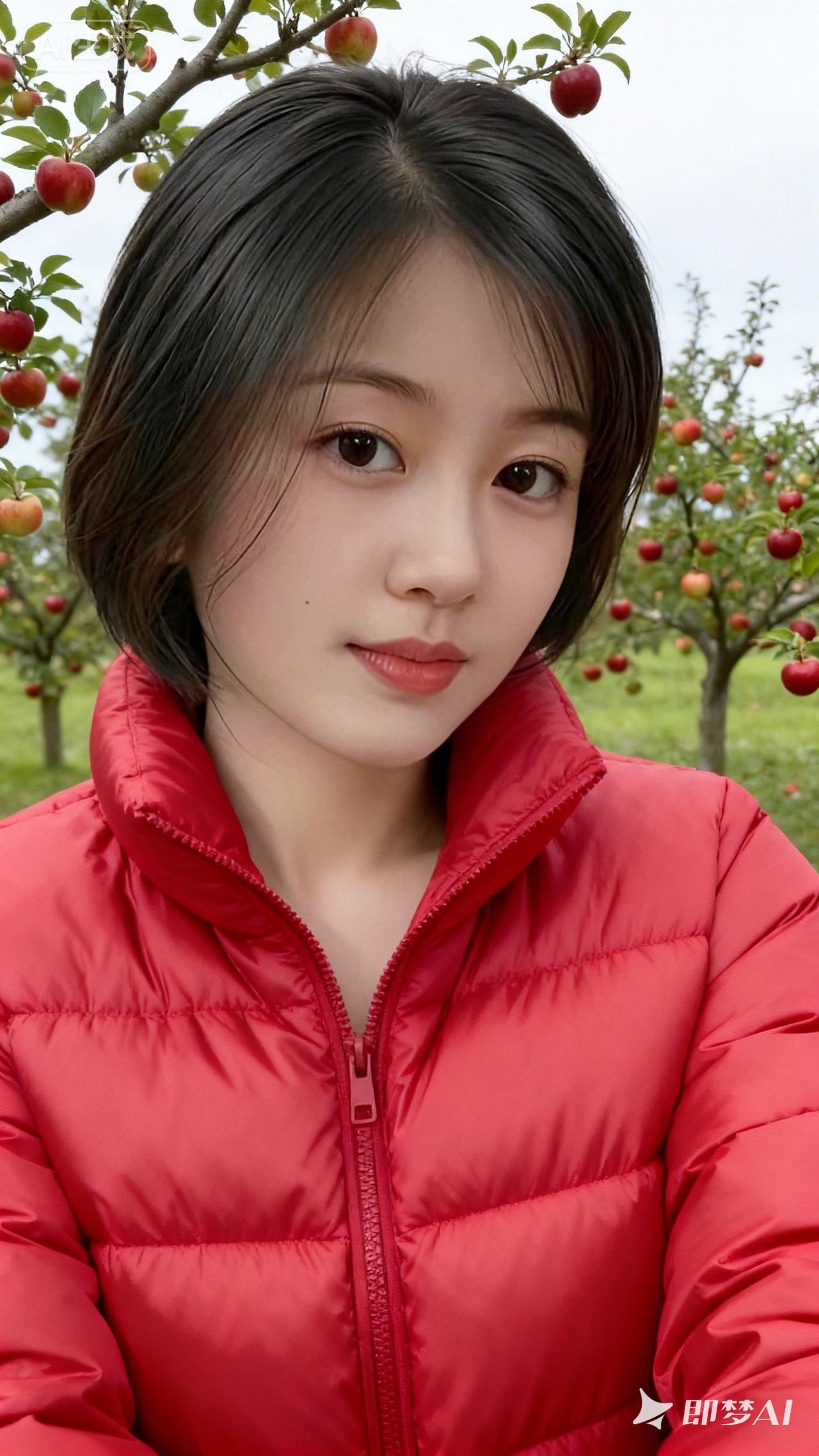 一位年轻女性,头发高高盘成丸子头,发丝自然散落几缕碎发,增添随性氛围;五官精致,